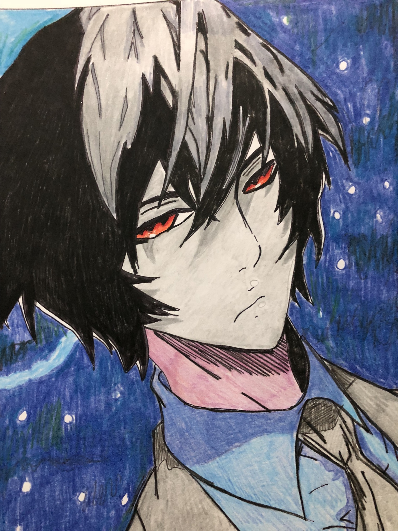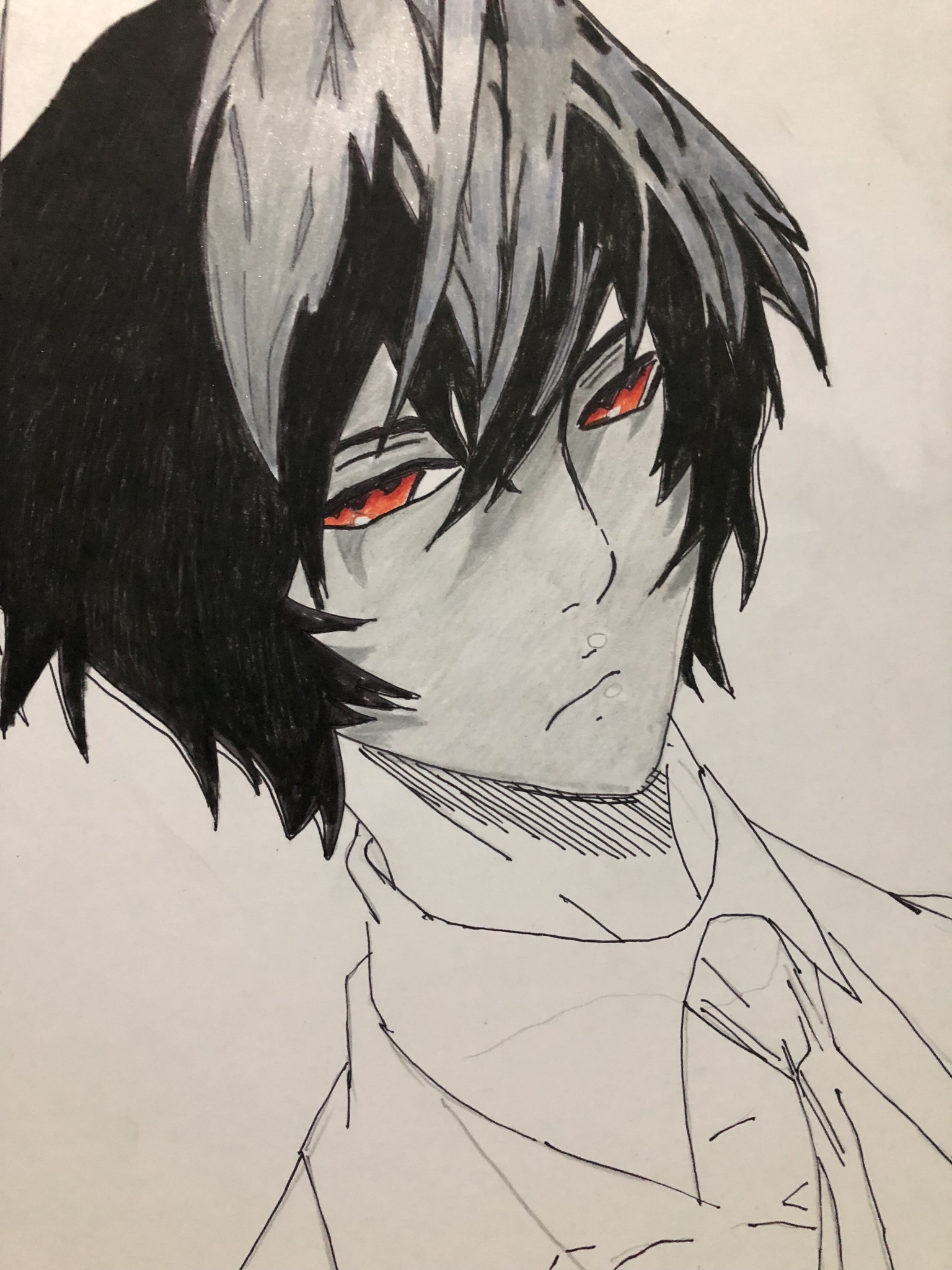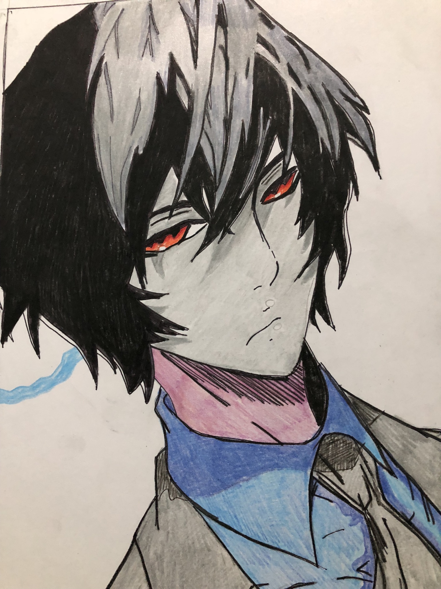 Step 4: Coloring the Face and Eyes. Going down, we move to the next step- the coloring of the face. First, I made sure that I would color the shadows from the hair first. I chose a darker gray shade. Then I colored the face, there are some areas of the face that I didn’t color for important highlights. Next to that was the coloring of the eyes, I use a red orange color pencils first for the eyes, I added a blood red color layer to add value on the eyes.