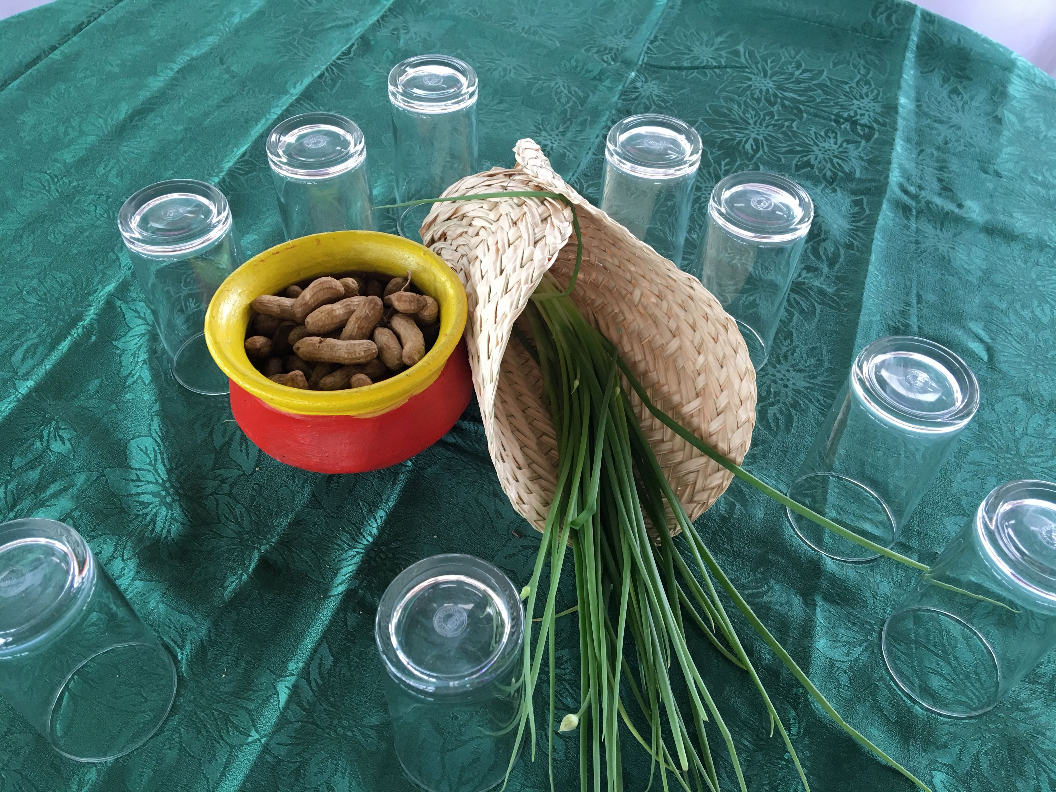Instead of the usual candles or flowers at the center of the table, they put a small clay pot or "palayok" filled with steamed peanuts and an "abaniko" that's rolled to imitate a flower bouquet wrapper. An onion spring is then placed inside it. Very pinoy-ish, must I say.