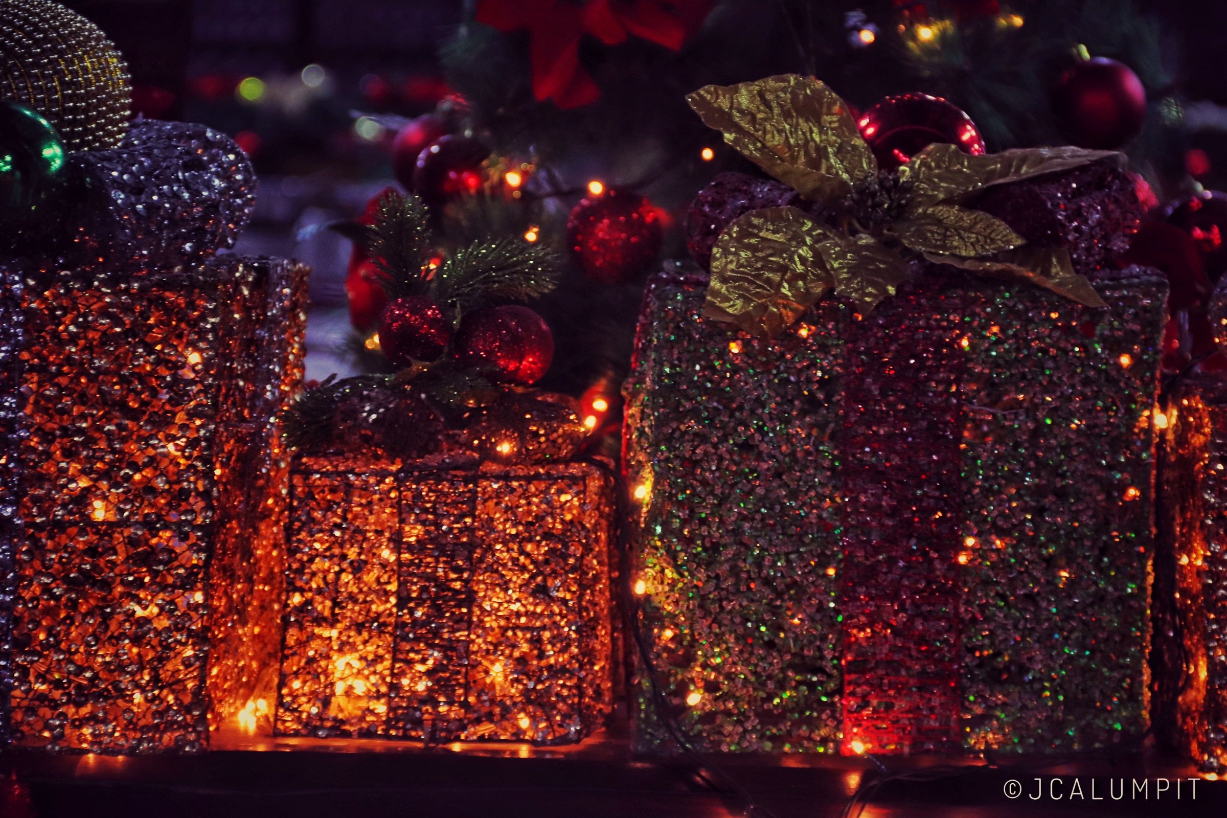 Gift boxes with Christmas lights inside.
