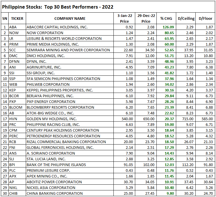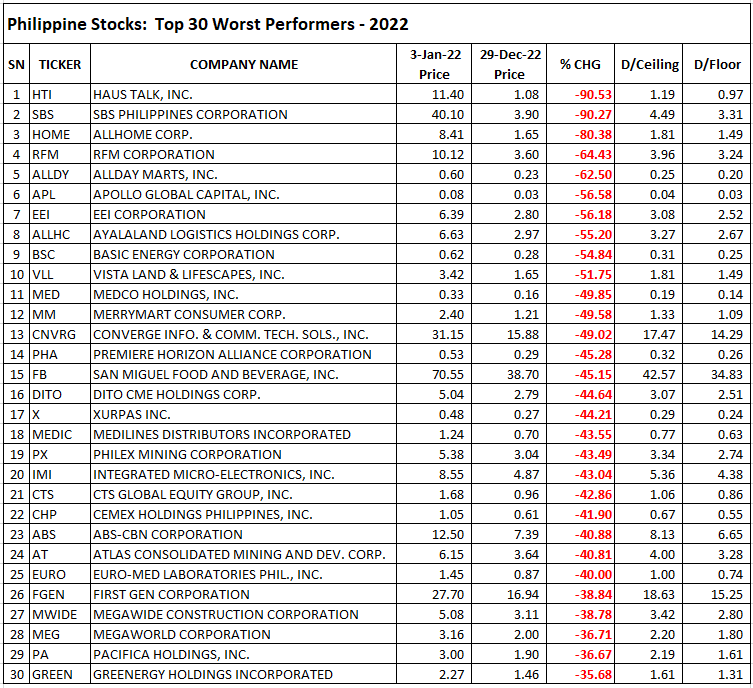 Bagama’t sa listahan ko ng mga kumikitang kompanya noong 2022, mag-ingat sa NOW, PRIM at DFNN yang mga stocks na yan ay paboriting laruin ng mga insders. Sa mga nangunguna naman sa bagsakan, marami dyan ang pag-aari ni Manny Villar: HOME, ALLDY, VLL at ang MEDIC na pag-aari ng kanyang kapatid, pero nasa listahan ko naman ang HVN at consistent ito tumataas sa nakalipas na 5 taon. Ang CNVRG, RFM at FB ay mga kompanyang may kakayahan at may fundamentals pero bagsak dahil pinaglaruan ng may mga first-hand information at hindi pa nakabawi sa pandemic hanggang sa ngayon. At ang ABS naman ay ang di pag renew ng kanilang prankisa sa Kongreso, sa pinakamaatas na presyo na P68.35 ngayon ay nasa P7.39 na lamang at hindi mo parin nabitiwan ito hanggang ngayon ikaw ay nasunog ng 89.19% at masakit na paso yan sa iyong portfolio.