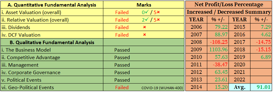 OBSERVATION: The global effect of COVID-19, which I always referred to as the WUHAN-400 plague, has a huge impact on URC. We are now in the recession cycle and most economists around the globe anticipated a greater than 1929 economic depression. If this prediction materialized, consumer spending may be on sluggish if not on hold that influences URC’s ability to maintain its projected profit. Now, is it time to invest URC? In my opinion, it is wise not to participate at this time due to the reasons above cited. Secondly, URC failed in my overall quantitative fundamental valuations. URC’s closed share price yesterday (17-Apr-2020) at 126.80 is 186% overvalued from my DCF per share calculation. However, in my worst-case scenario, if my DCF share price of 44.40 which is my target price will be broken in the coming months then time to invest all-in.