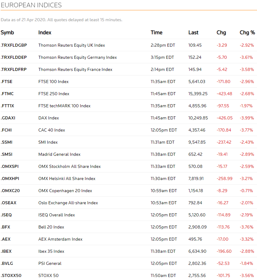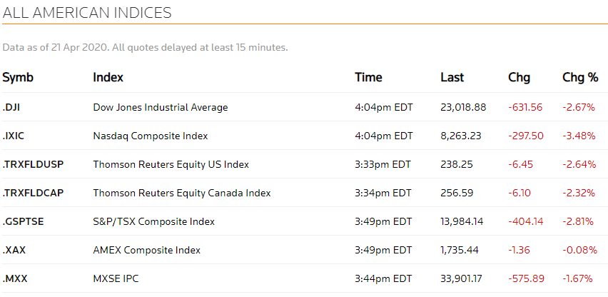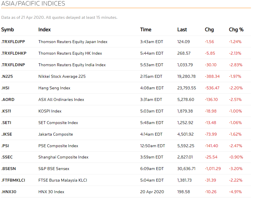 Tuesday, 21-April-2020. World Stocks retreated for a second straight day today as a collapse in U.S. crude prices and glum annual forecasts by companies foreshadowed the biggest economic slump since the 1929 Great Depression.
