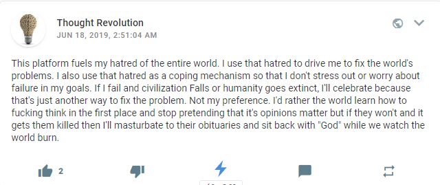 You heard it here first, folks. Thot is pro-war, pro-racism, pro-darkness(?), pro-science denial, and against all of humanity. These are not positions I strawmanned him with, he voluntarily wrote a blog to declare this about himself. He specifically says that anyone referencing or defending things in this list are being manipulative, and should be opposed on principle, regardless of context...