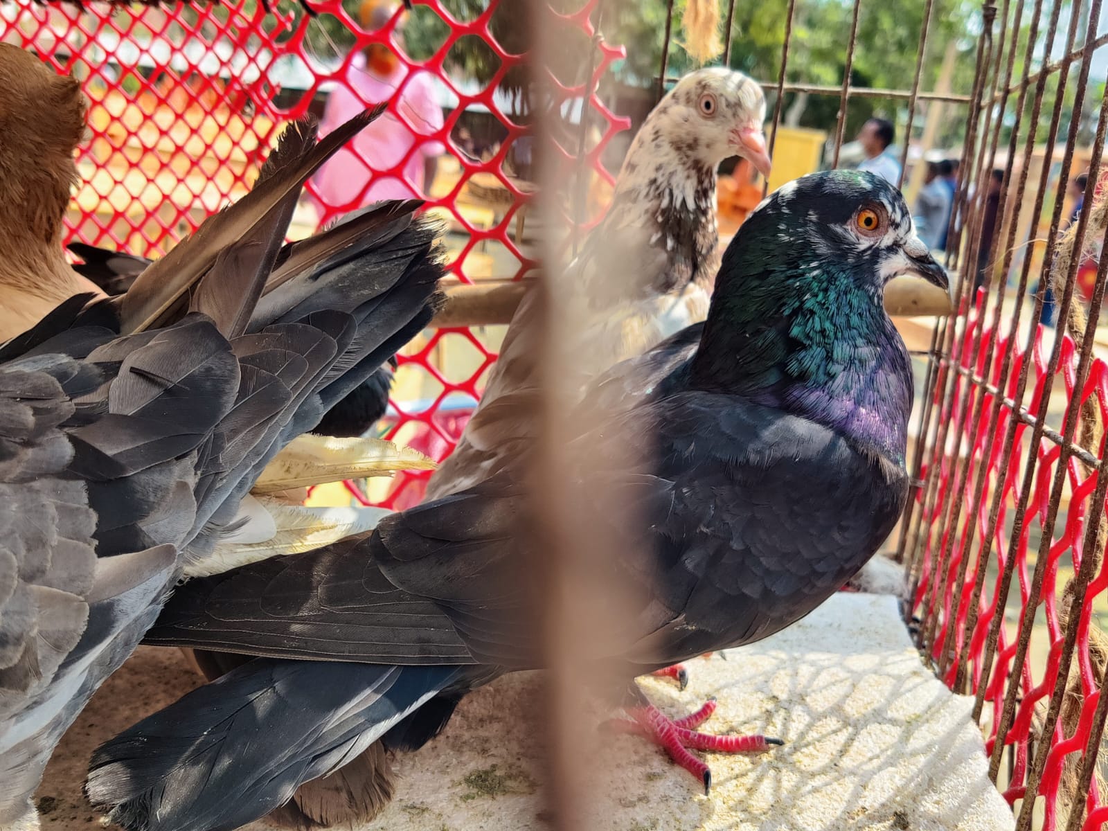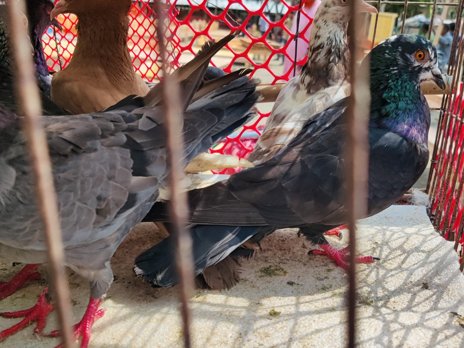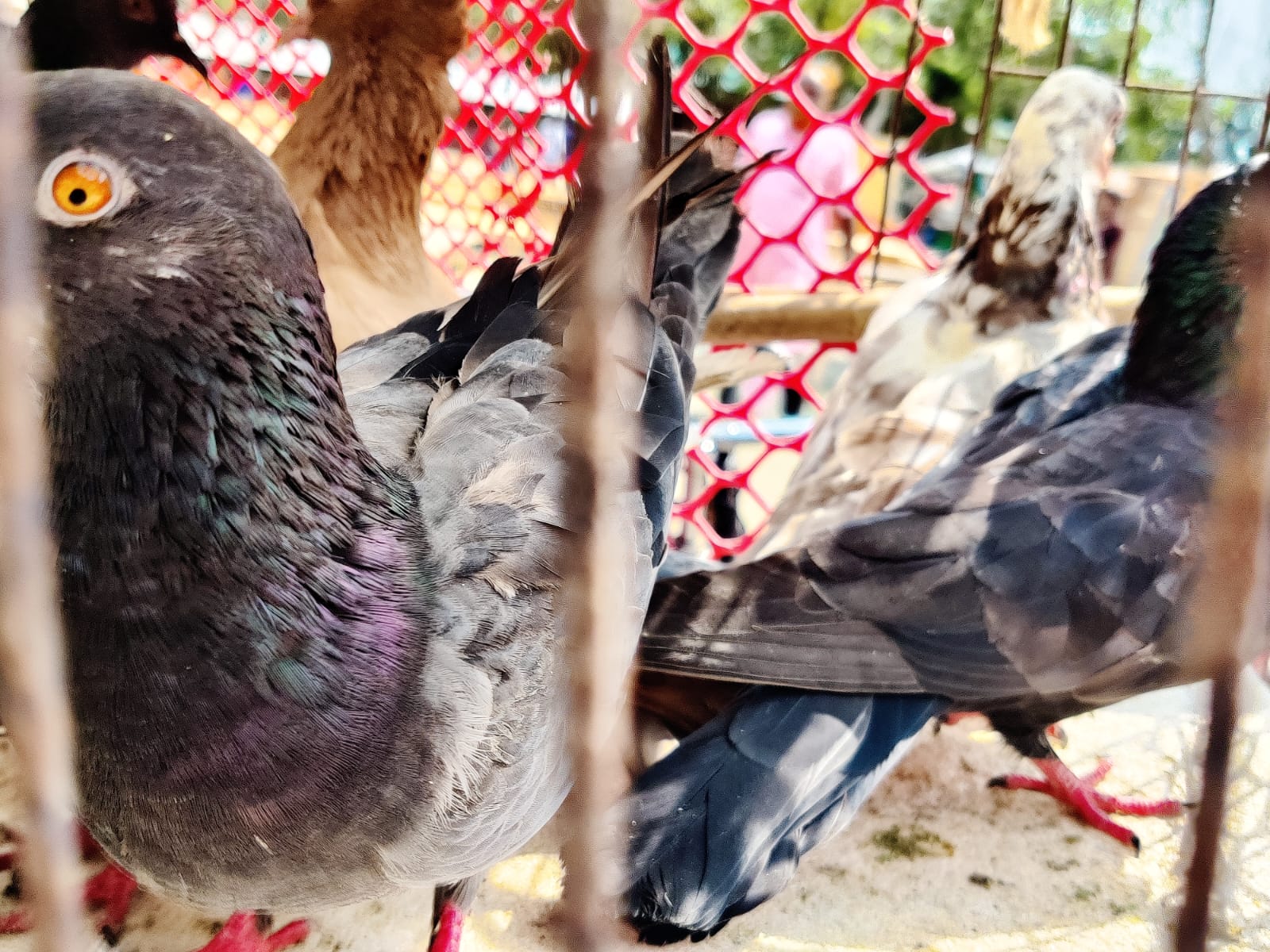 Here, many pigeons have been kept arranged inside cages. These pigeons were mainly brought to the market for selling. Inside the cages, there are pigeons of different colors, and they can be seen very nicely here.