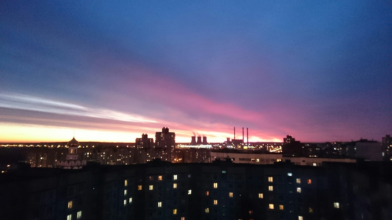 В городе загораются огни, а небо гаснет под красивый закат