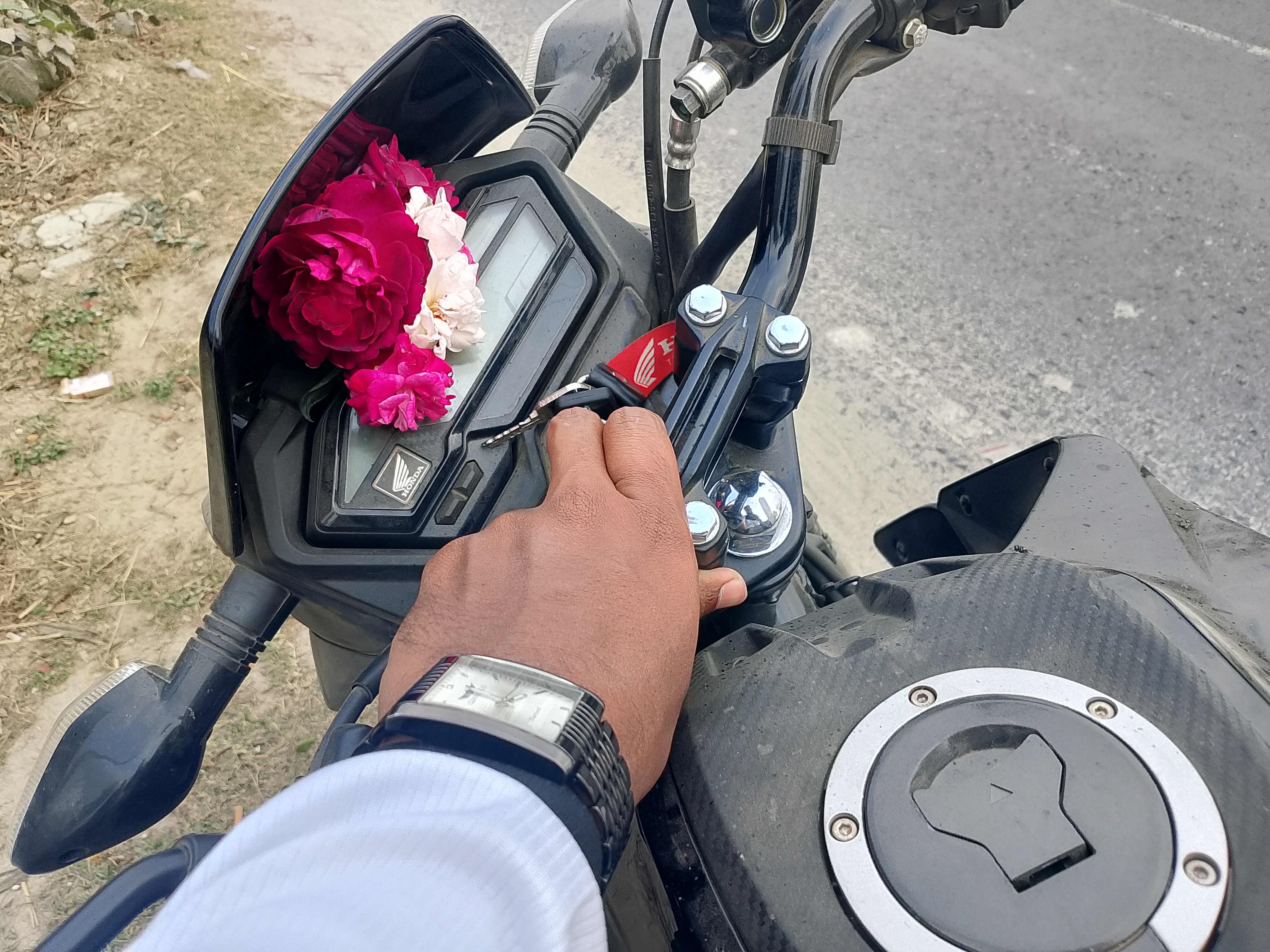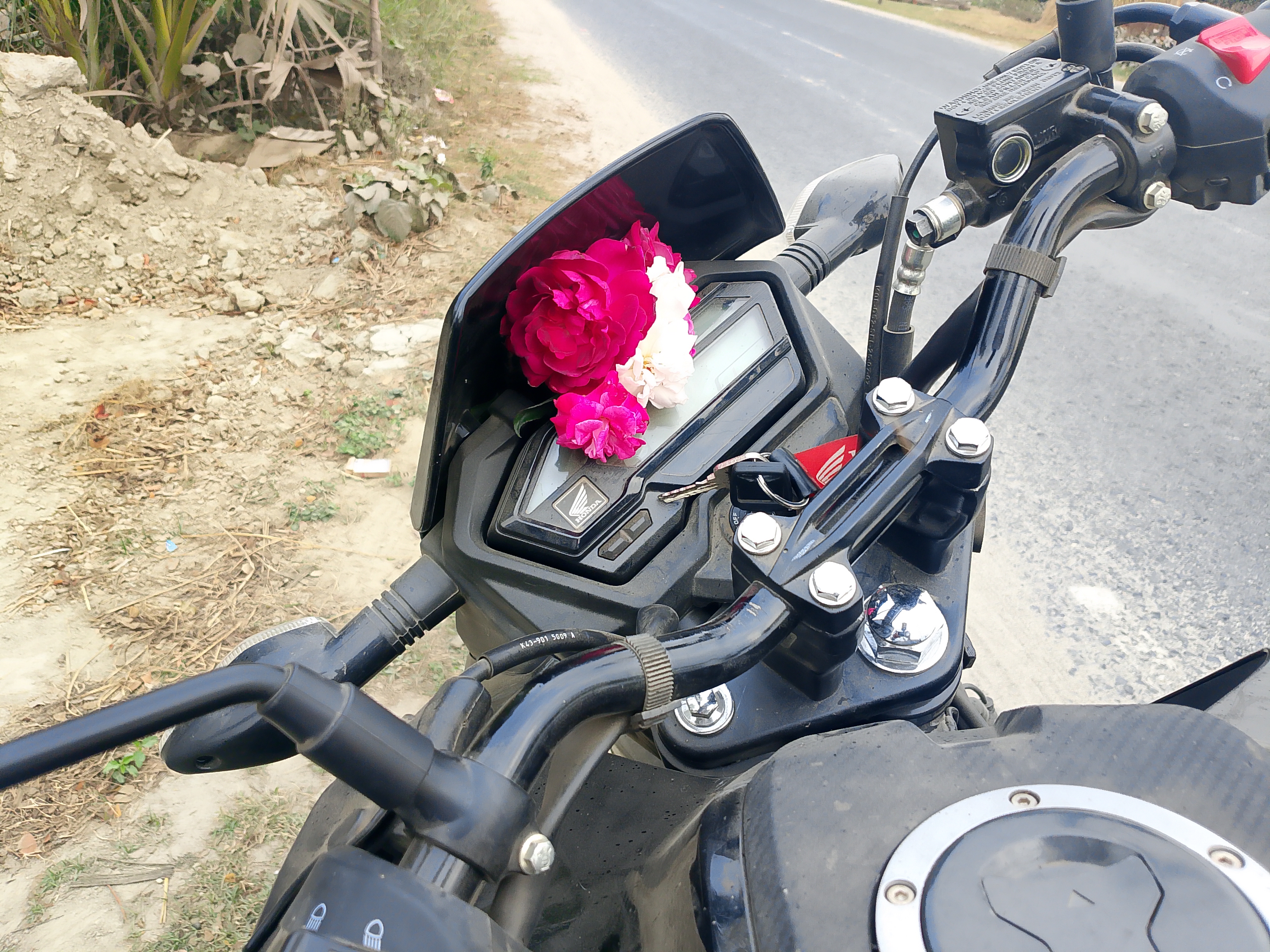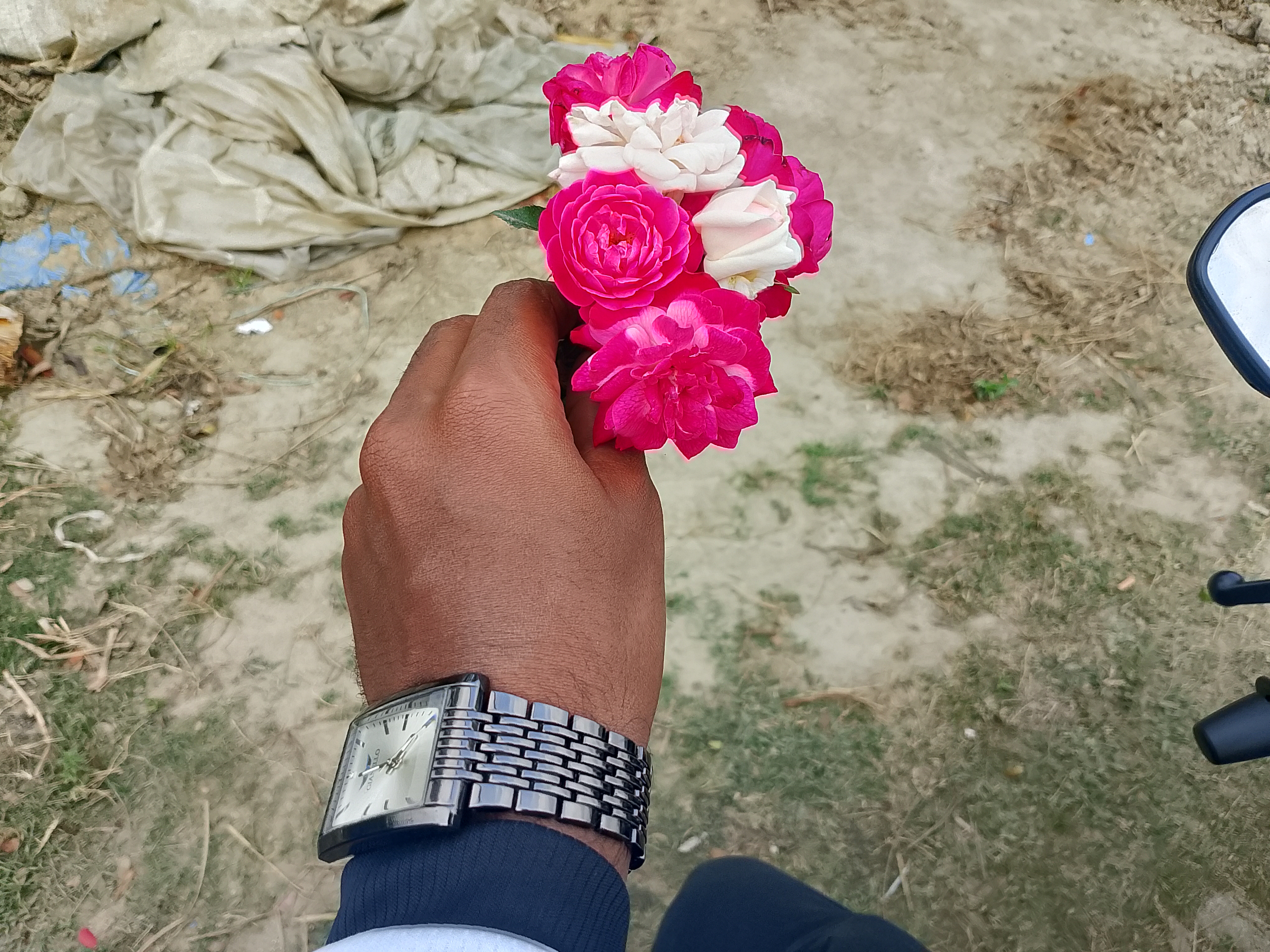 There are a few beautiful rose flowers here. I went outside to take those flowers, and after holding them in my hands, I came back from there and placed the flowers in the front part of my motorcycle. The flowers here are very small and look very beautiful and nice. These small flowers are very good because of their colors, and they look very nice to me. I took some pictures of these flowers, and now I will share them with you.photo