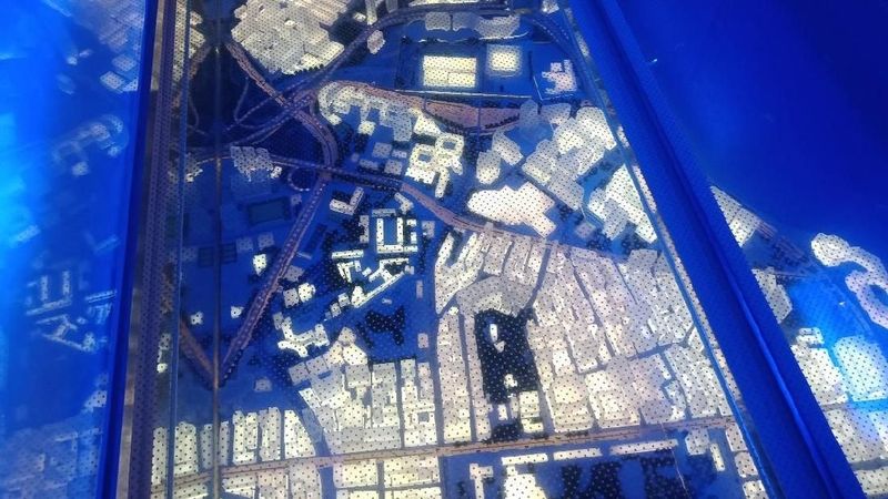 To climb to the top we use the elevator. Out of the lift, visitors will then see a transparent floor containing the arrangement of Hong Kong's scenic models.