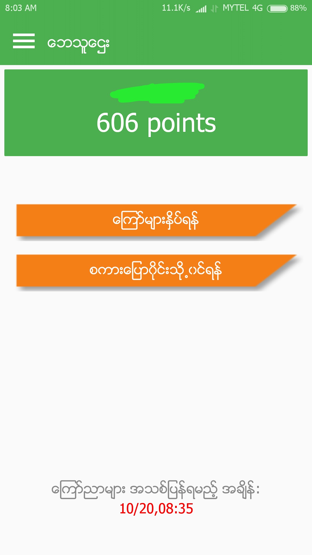 point 500 ျပည့္ရင္ ဖုန္းေဘ 1000kyats နဲ့ လဲလို့ရတယ္။point နဲ့ ဖုန္းေဘ လဲဖို့အတြက္ facebook က ေဘသူေဌး page မွာ page admin နဲ့ မက္ဆင္ဂ်ာကေန ဆက္သြယ္ျပီး လဲလွယ္ထုတ္ယူႏိုင္ပါတယ္။