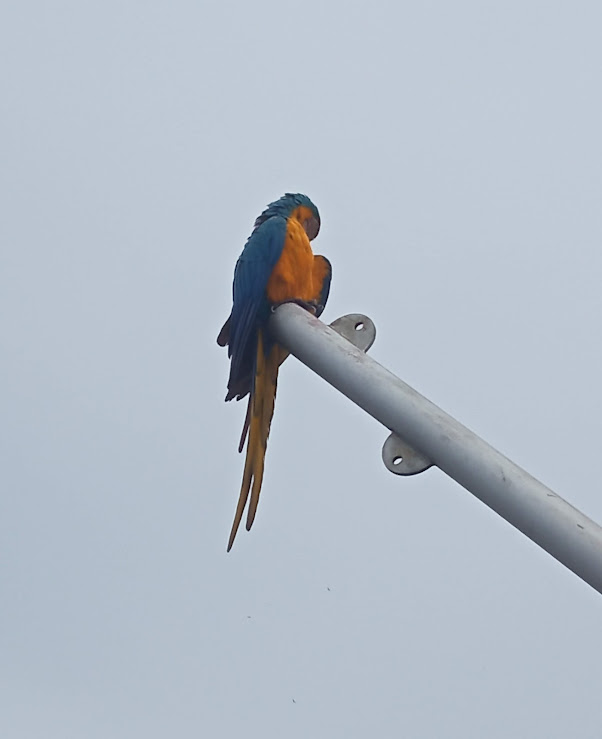 Today, as I was walking along the boulevard, there was a blue-and-yellow macaw perched on a post. It's very common to see scarlet macaws on the boulevard, but the blue ones are hard to find there, and those are my favorites. It's not that I don't like the red ones, but I find the blue ones prettier, just as I prefer the blue roses to the red ones.