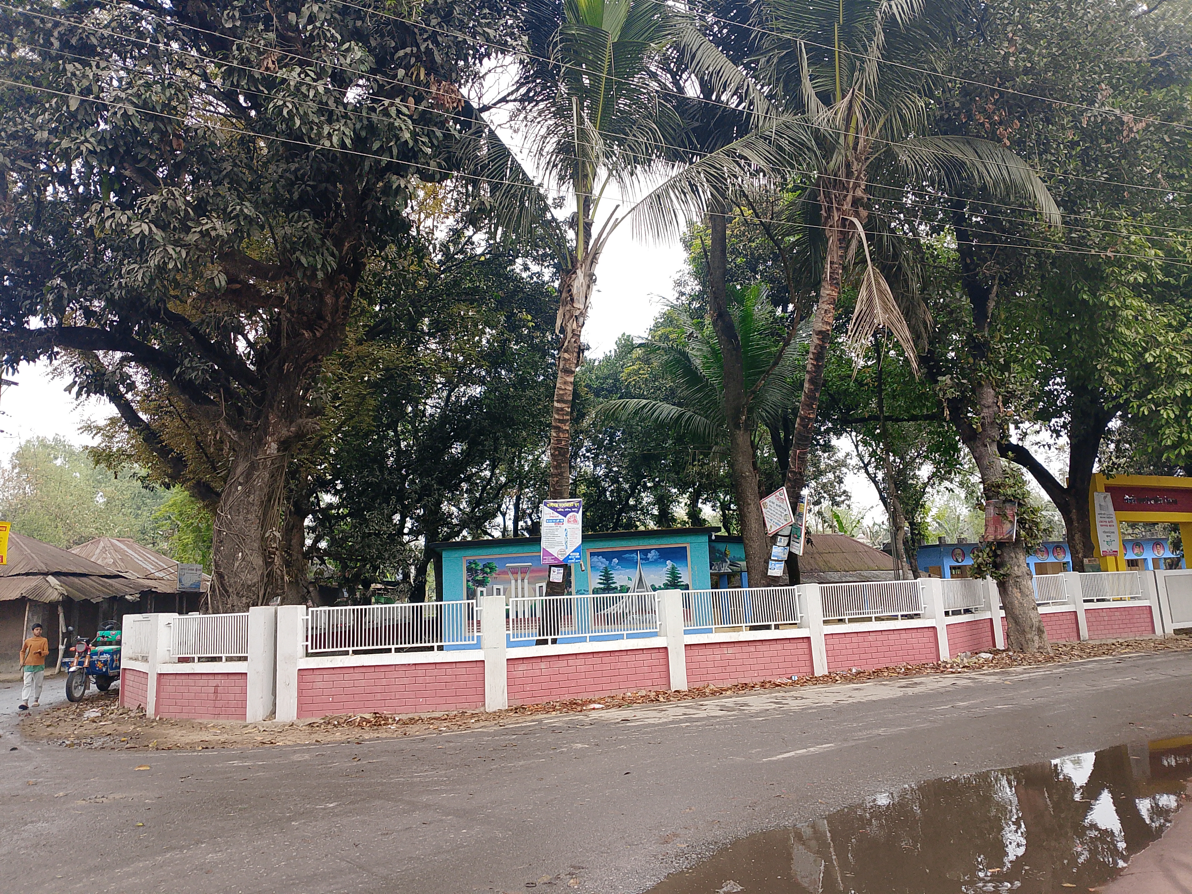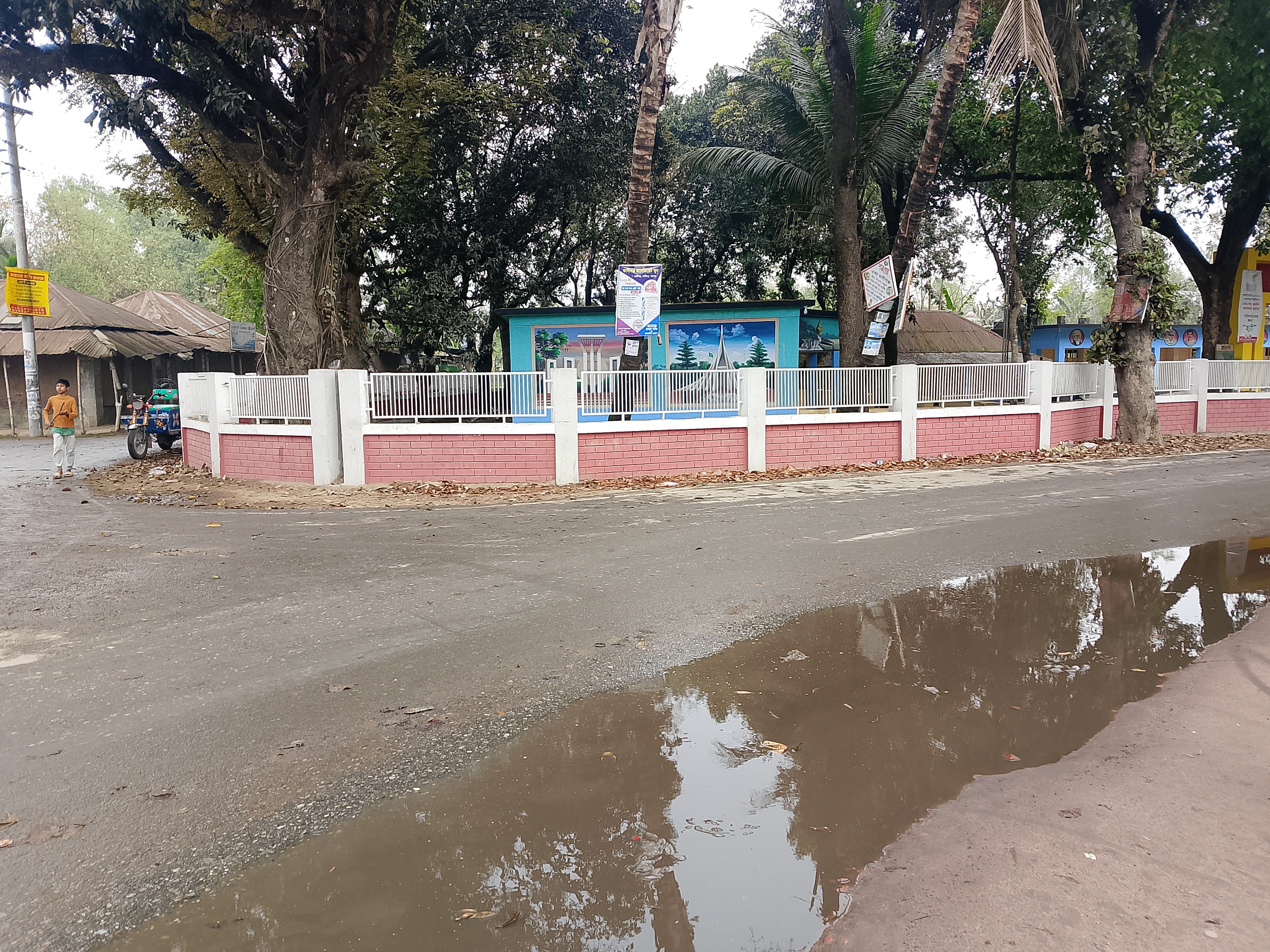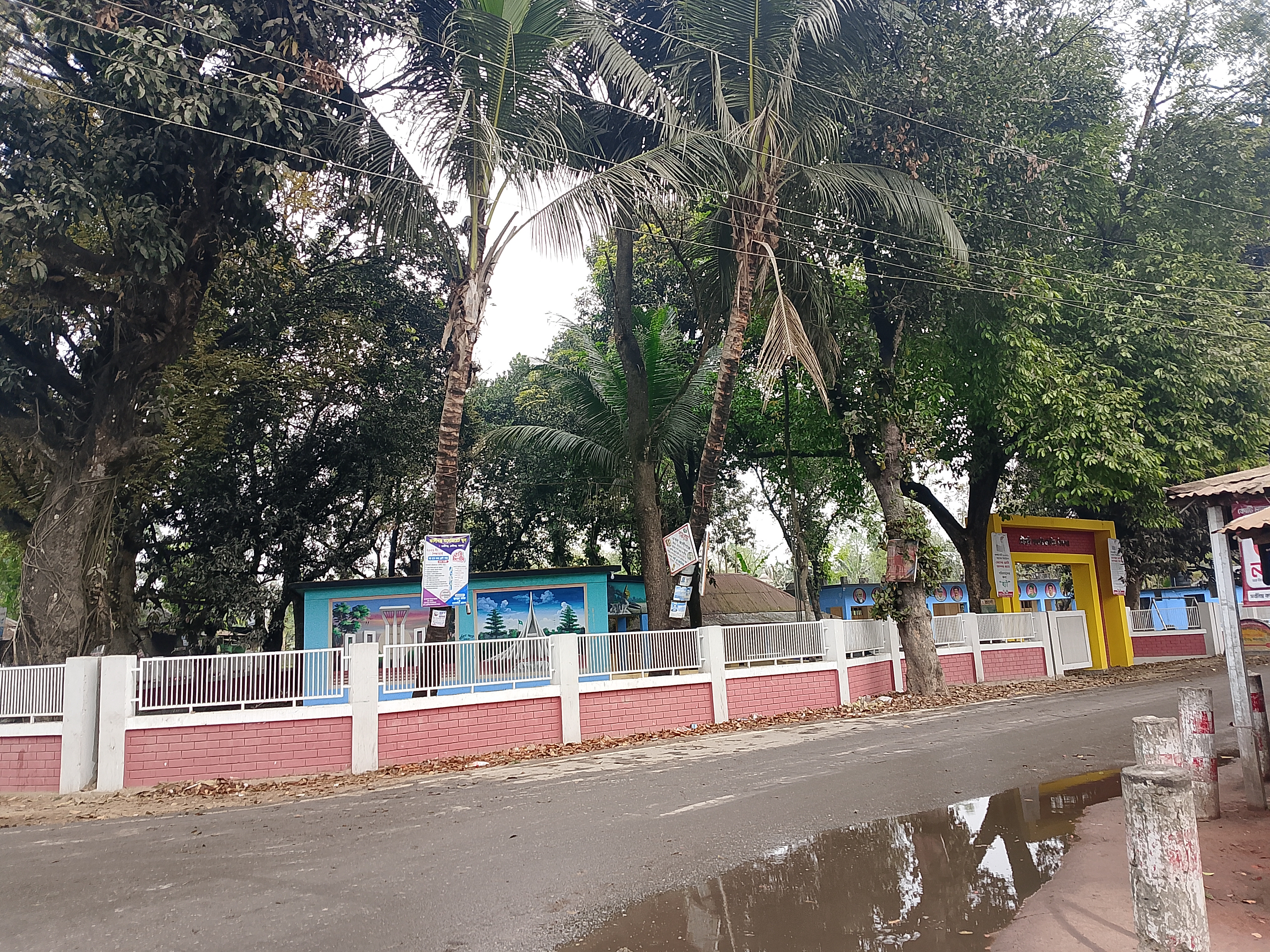 This is a roadside area that has been nicely enclosed with a grill and a half wall. Inside, there is a primary school, which is why it has been properly fenced. The road here has some water on it, and water has accumulated because it rained at night.