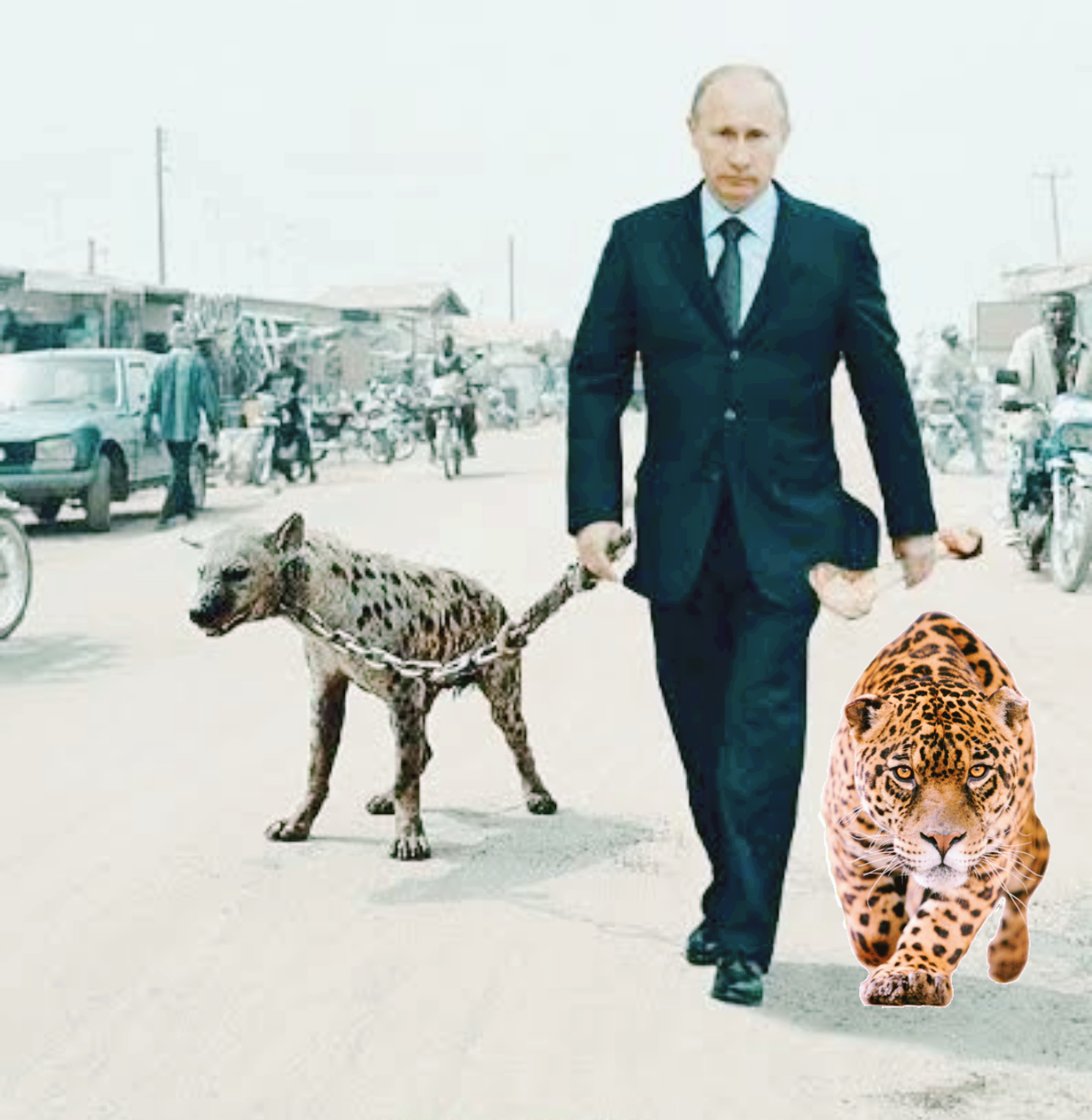 The chained hyena and Putin holding a bone got me. This photobomb is badass AF. HAHAHA!