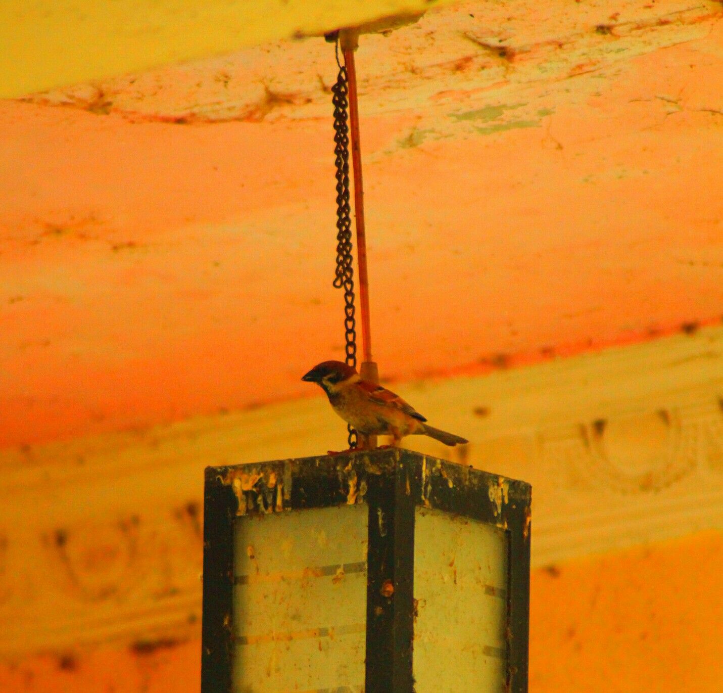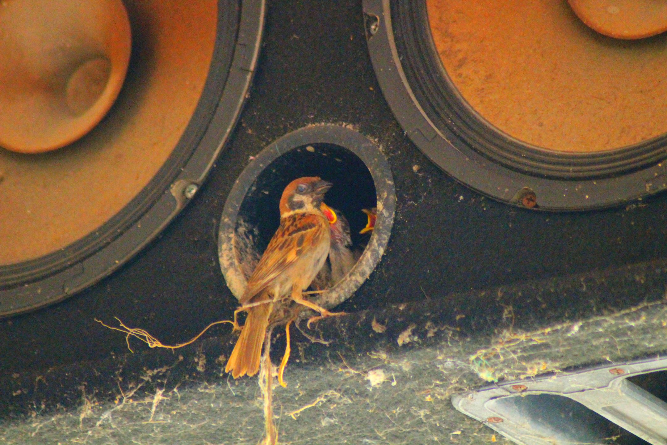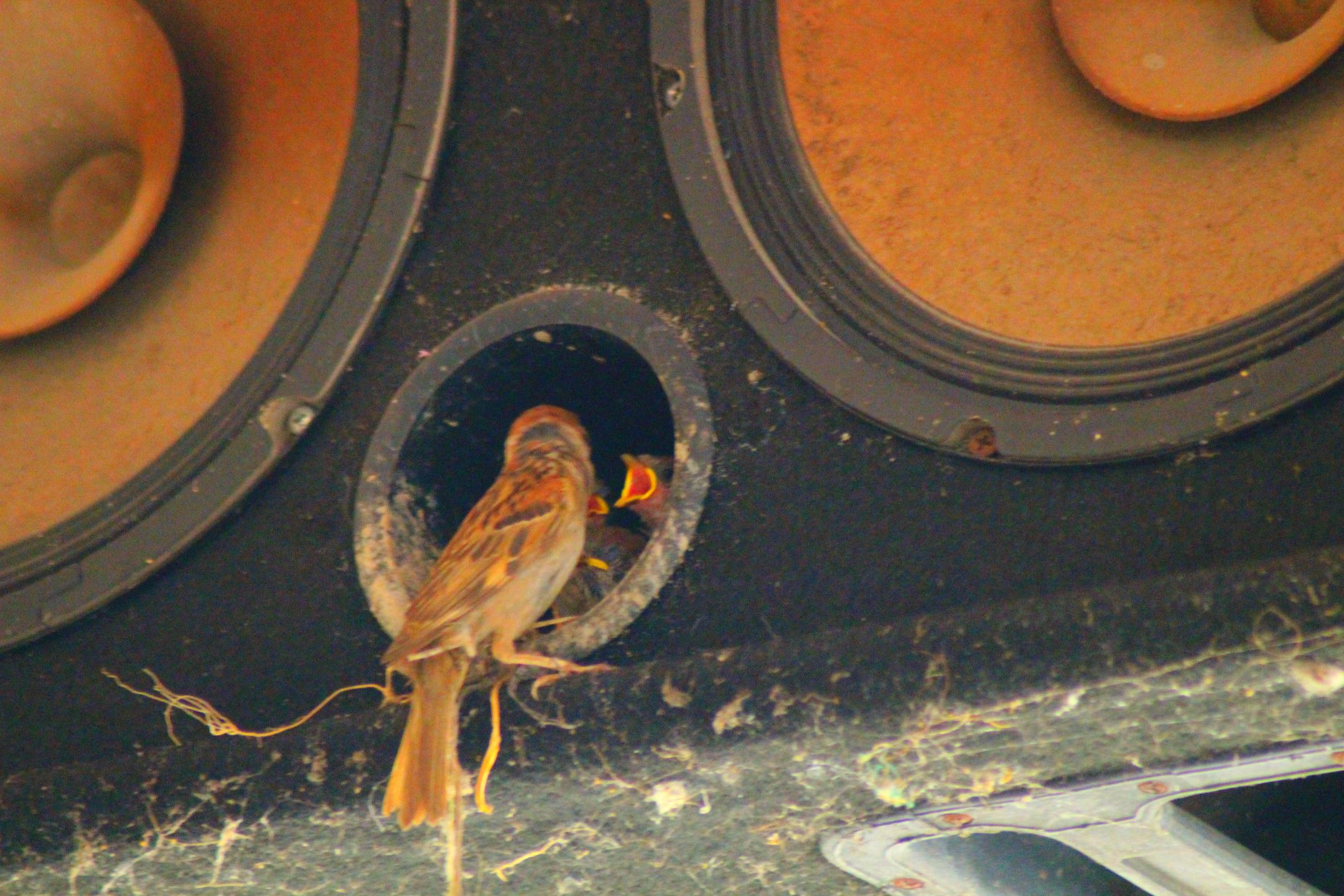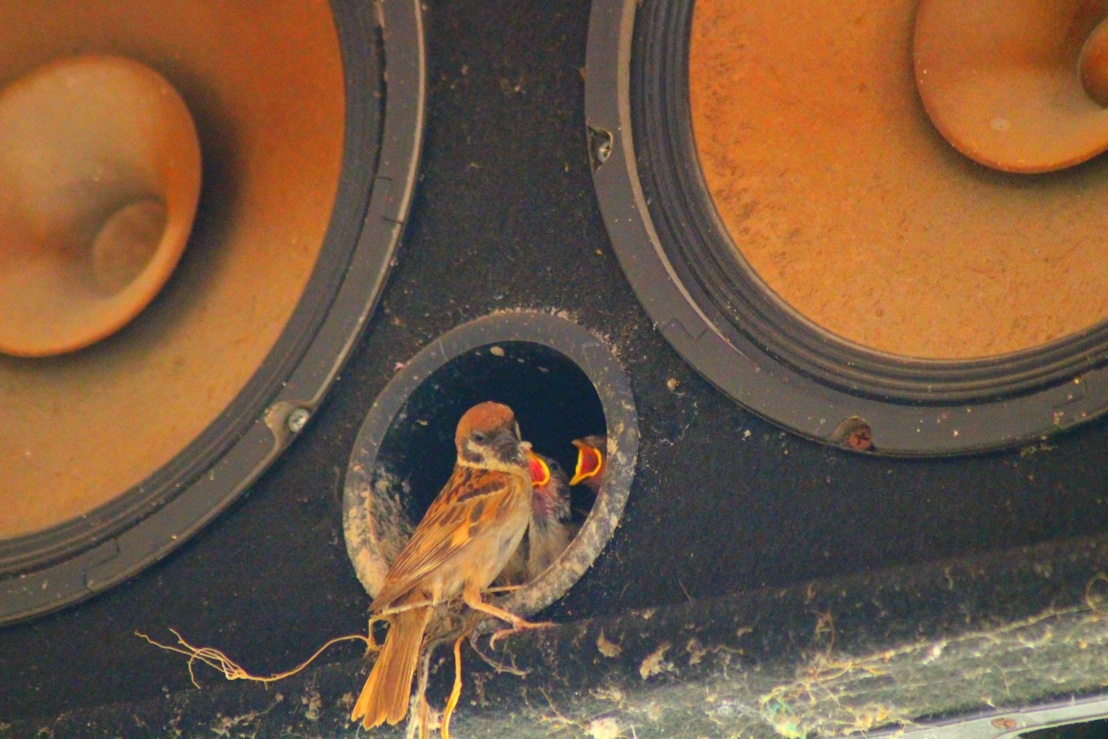 It turned out that on one of the speakers there was a sparrow in and out, and I kept watching it well. And certainly not wrong with my guess that the bird is nurturing his newborn child by providing food.