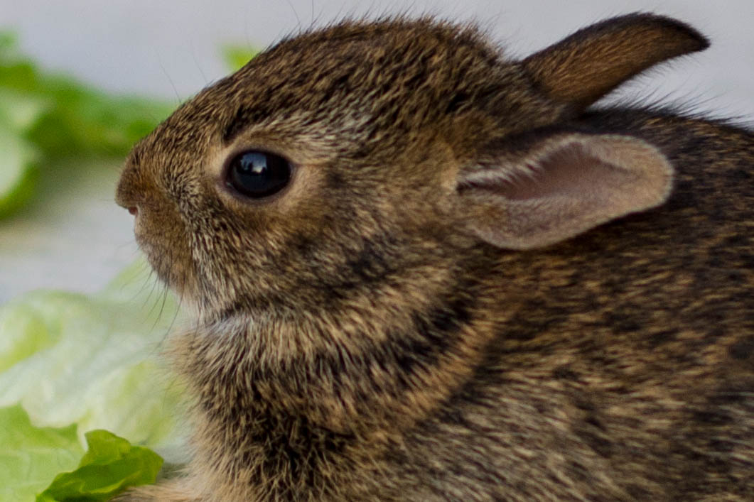 He was too unprotected for my liking. I crept outside to see if he would hop into the bushes. He didn't flinch and I began wondering if he might be injured. I recognized the rabbit freeze — ears lowered, breathing unnoticeable, dead stare. He wasn't old enough to jump away.