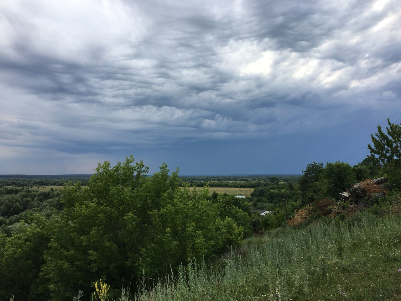 Beautiful open spaces from a bird's-eye view. The rain is approaching, the sky is dark. In the distance, you can see pastures and meadows. A stunning picture!
