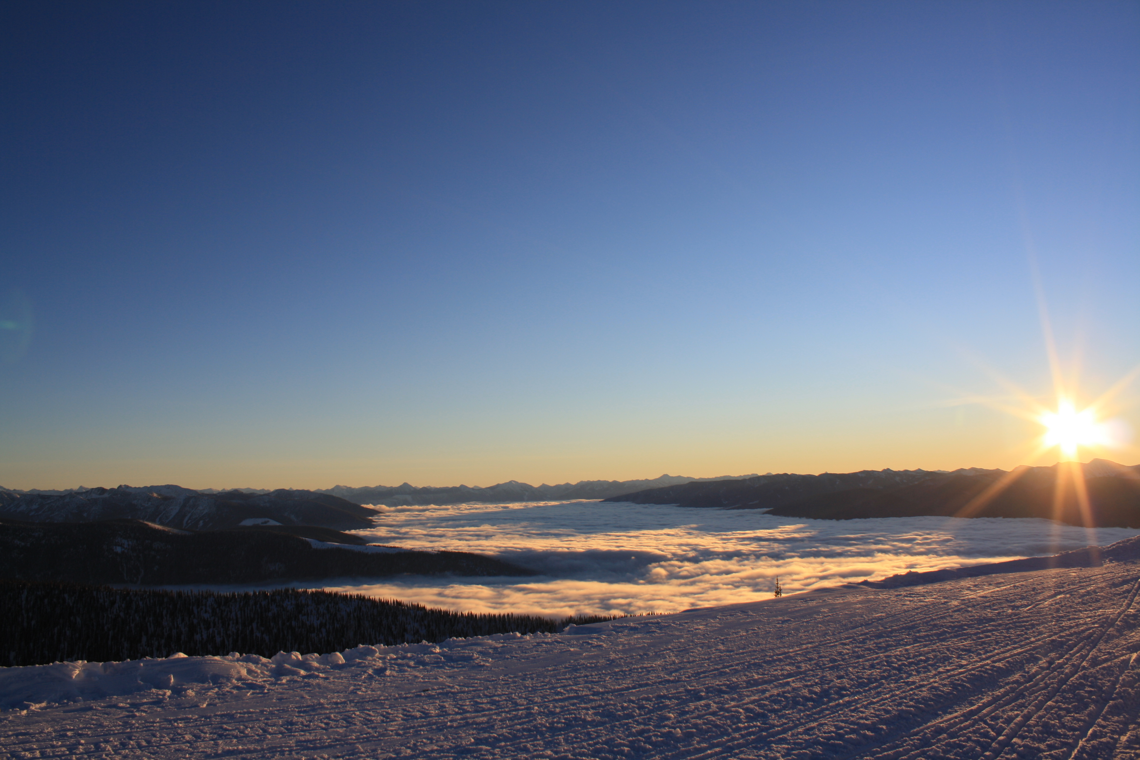 I took this photo at sunset from one of the highest peaks in the Kootenay Mountain range, near Nelson, British Columbia, Canada. In fact, the clouds below are due to an inversion which had shielded Nelson from the sun for many days. On the horizon you can see other mountain peaks in every direction.