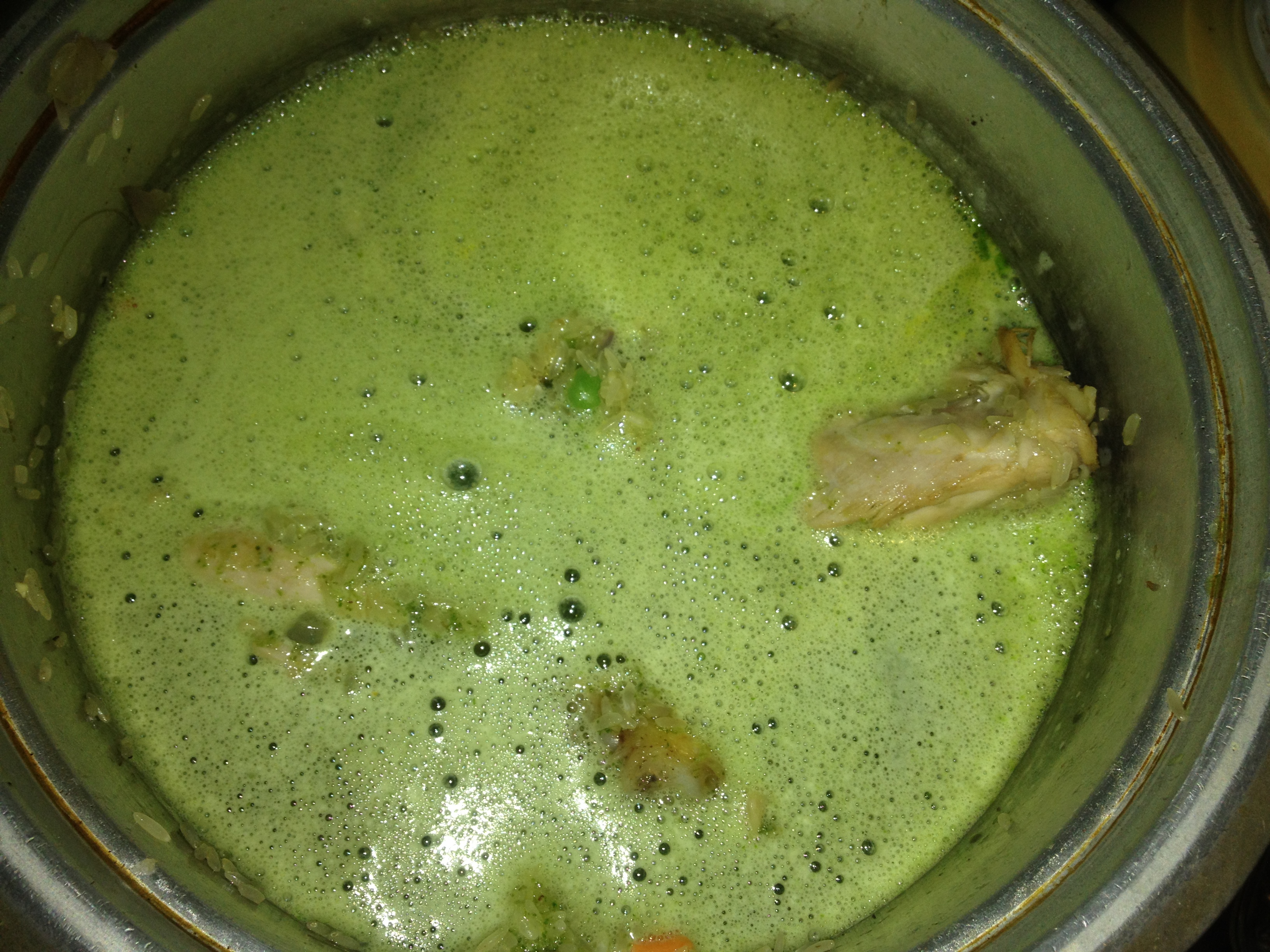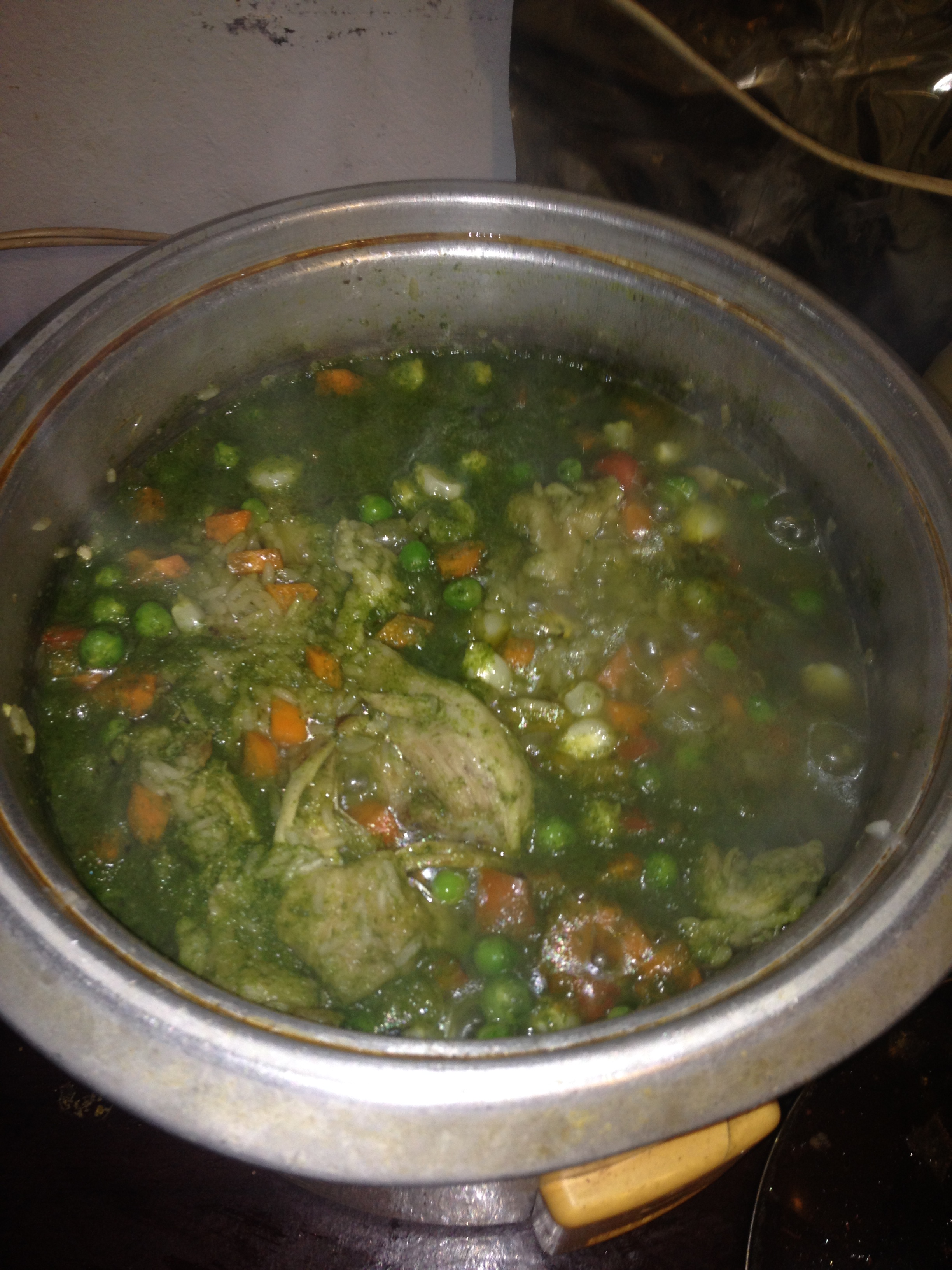 Cuando el arroz este frito añadir el cilantro licuado y revolver, tapa la olla, cocinar hasta que te lo indique la olla