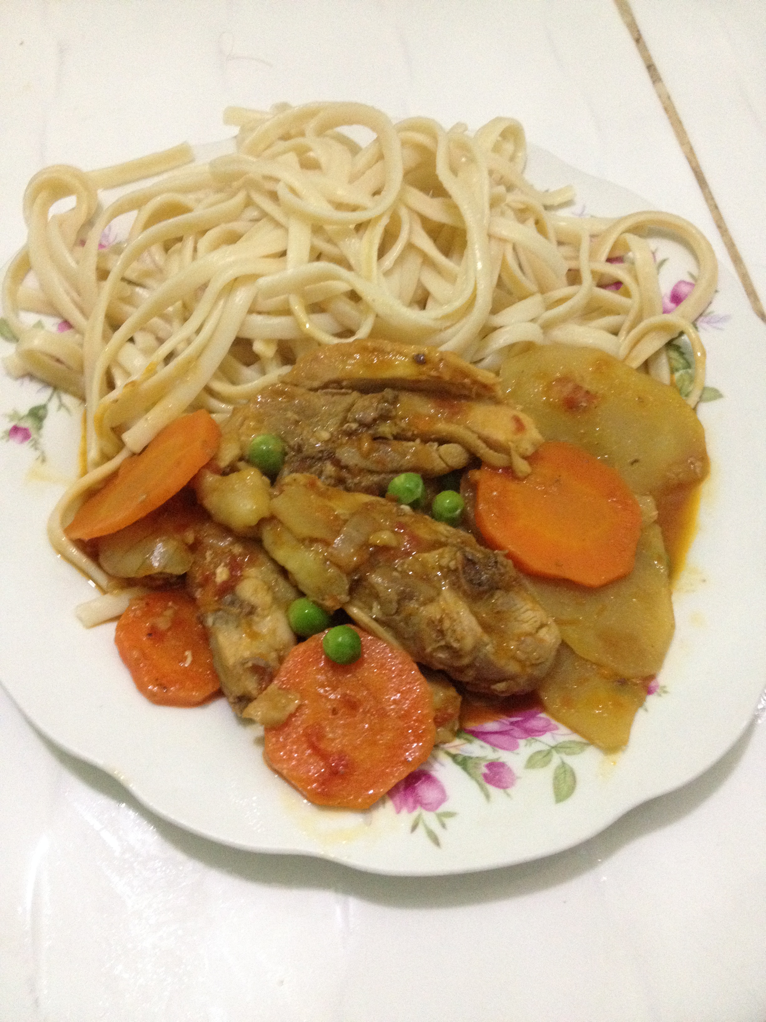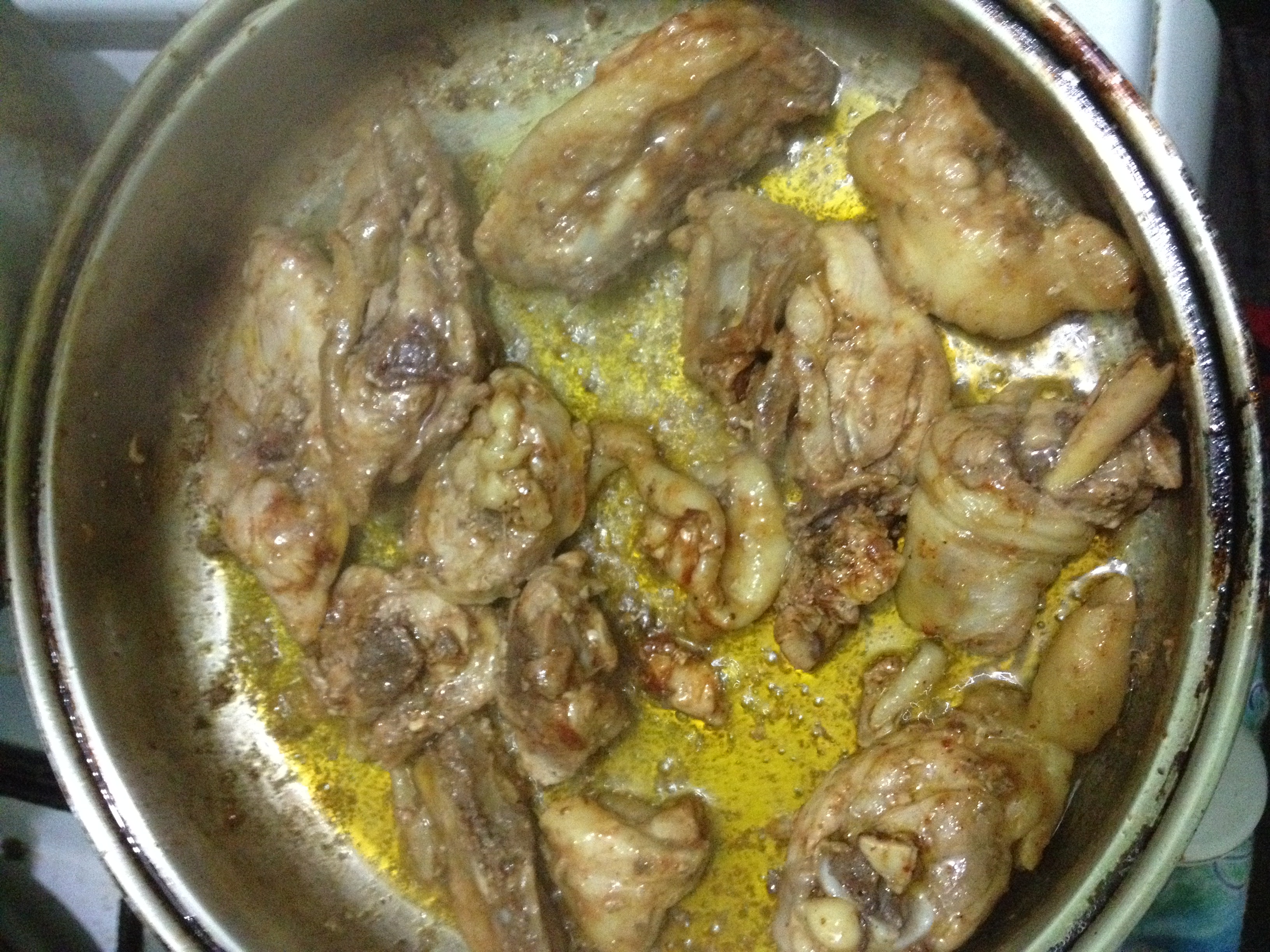 Luego sofreímos en una salten amplia el pollo hasta que este sellado, luego le añadimos los condimentos para darle color y sabor.