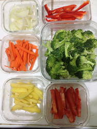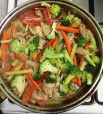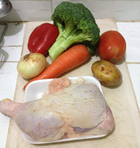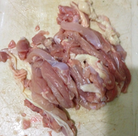 Cortamos todos los ingredientes en julianas y el pollo en forma de estragón, sin hueso.