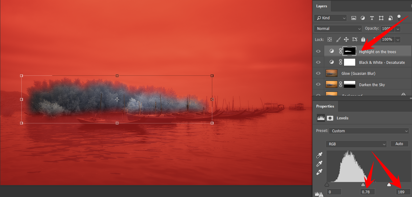 For this, I used the lasso tool to roughly select the trees and after feathering the selection I added a levels adjustment layer and change the white point and the contrast from the bright side of the histogram to add a highlight to the trees.