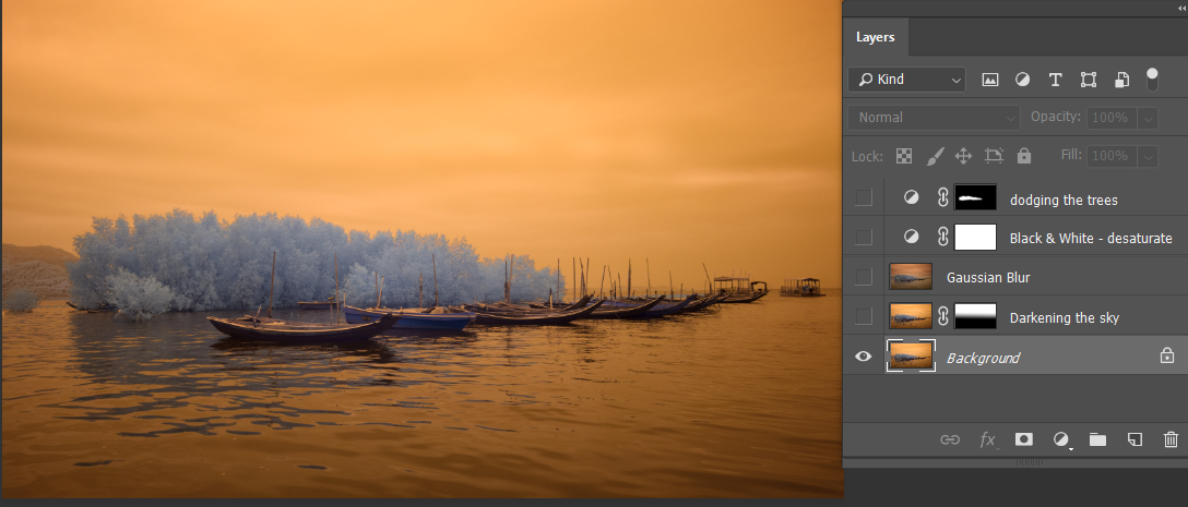 At this stage, I was really happy with the photo, but I thought that by dodging the trees a bit I could introduce them as a prominent feature that would aid in keeping your interest in the photo.