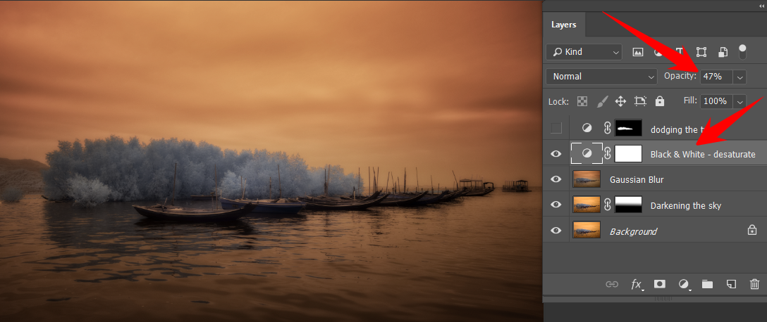 Although I liked the softness of the photo, especially the slight glow around the high contrast areas, I did not like the oversaturation that was introduced by the hard light blending mode. I decided to use my old trick of adding a black & white layer to the photo to bring down the saturation. I usually do not change the default values of the black & white layer, I only change its opacity to be in the region of 50%.