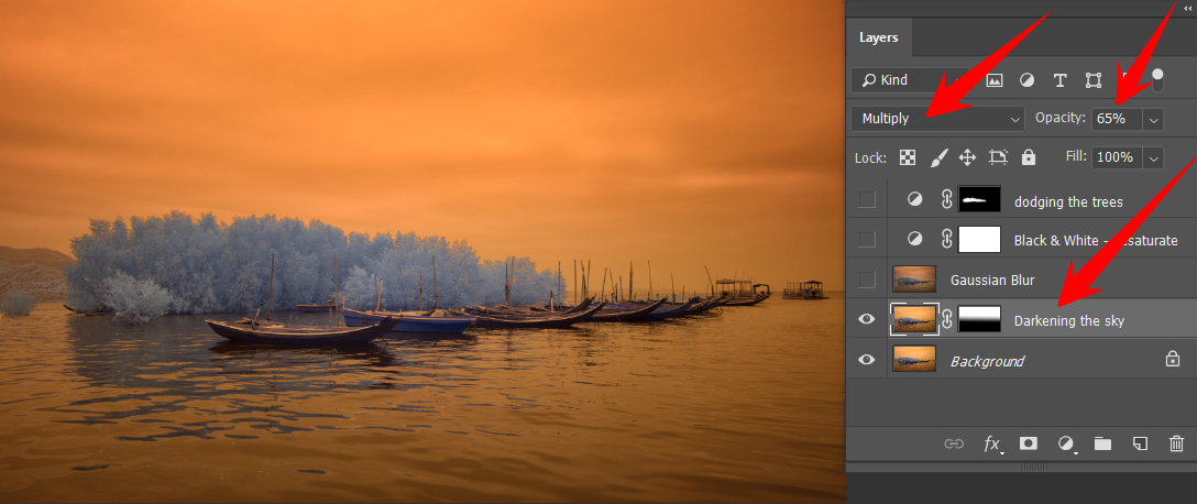 I started by darkening the sky. For this, I duplicated the original layer, add a gradient mask to ensure only the sky is changed and then changed the blending mode to Multiply and, because the effect was a bit too much for my taste, I changed this layer's opacity to 65%.