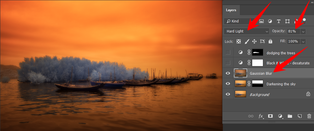 In this case, I liked what I saw but I thought that a softer look would emphasise and laid-back mood of that afternoon better. I, therefore, decided to merge the two layers into a new layer and add a gaussian blur to the layer to soften it. I wanted to accentuate the lines in the photo while keeping the softness of the blur and therefore changed its blending mode to hard light. I also brought back the opacity of this layer slightly as the effect was a bit too much.