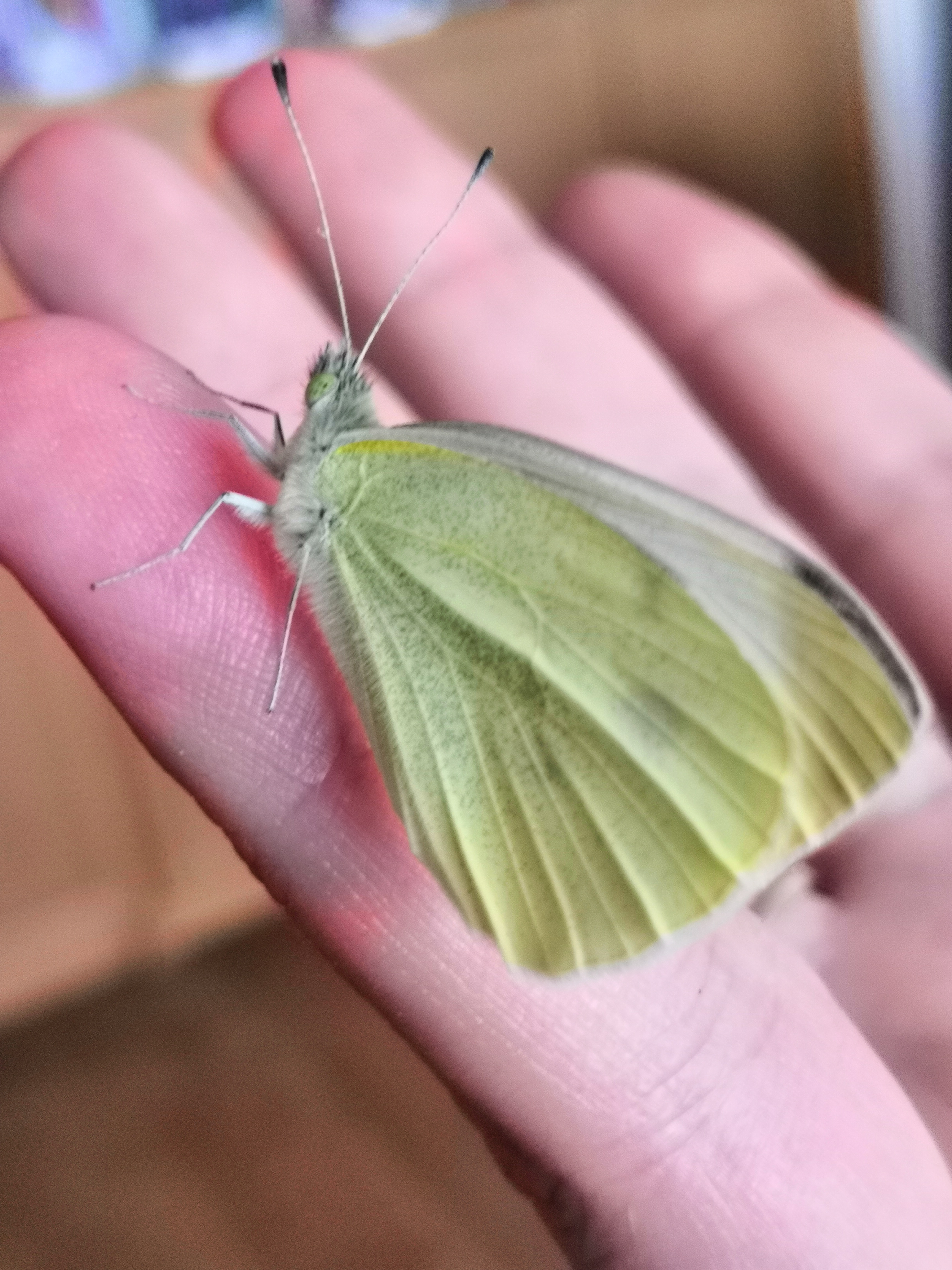 I don't know much about butterflies, but I did hear that you're not supposed to catch them by the wings (not even lightly), because it can harm them. So instead I slowly approached and got my finger close to the butterfly, and to my great surprise, it simply climbed on me and stayed there.