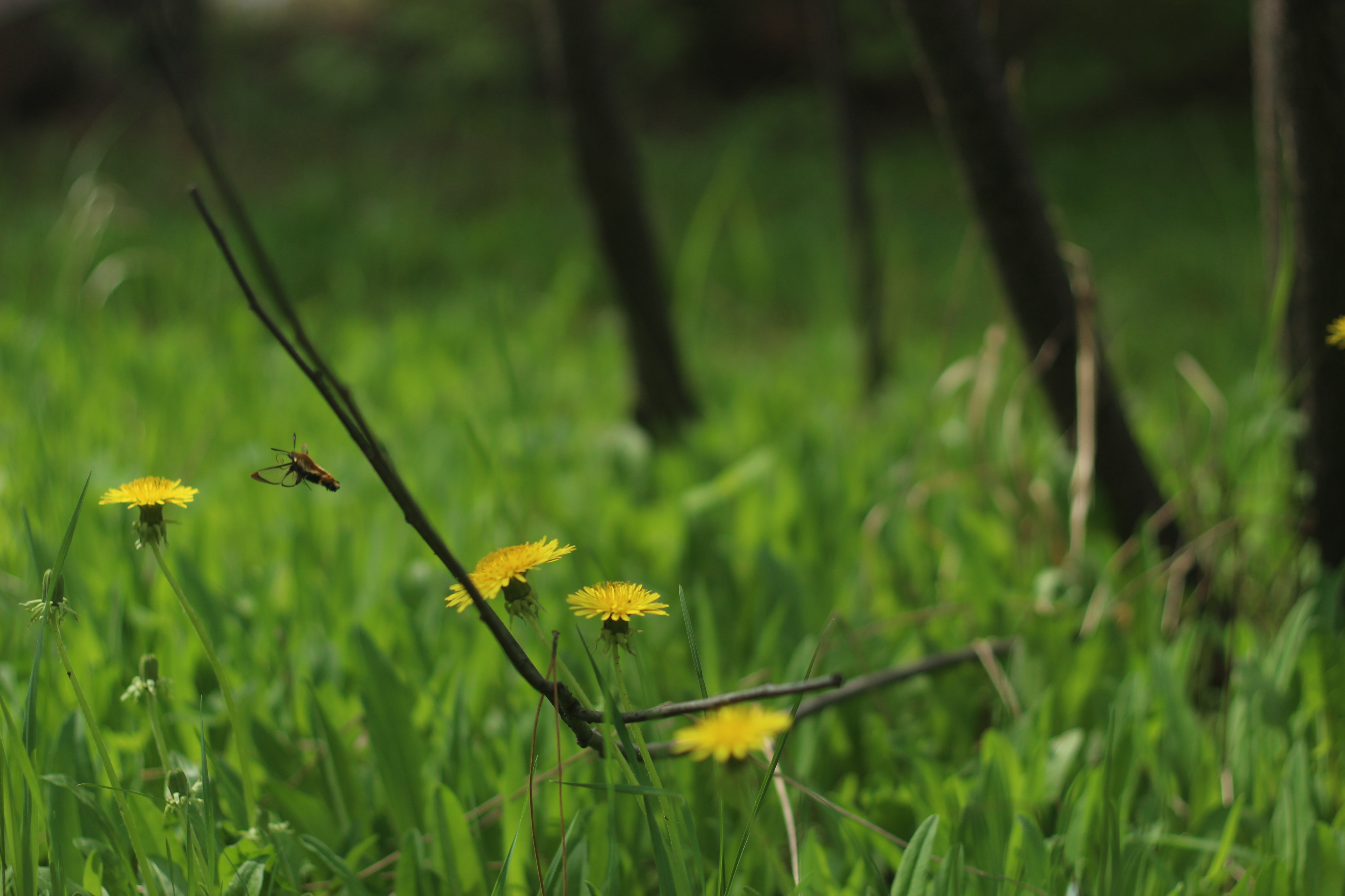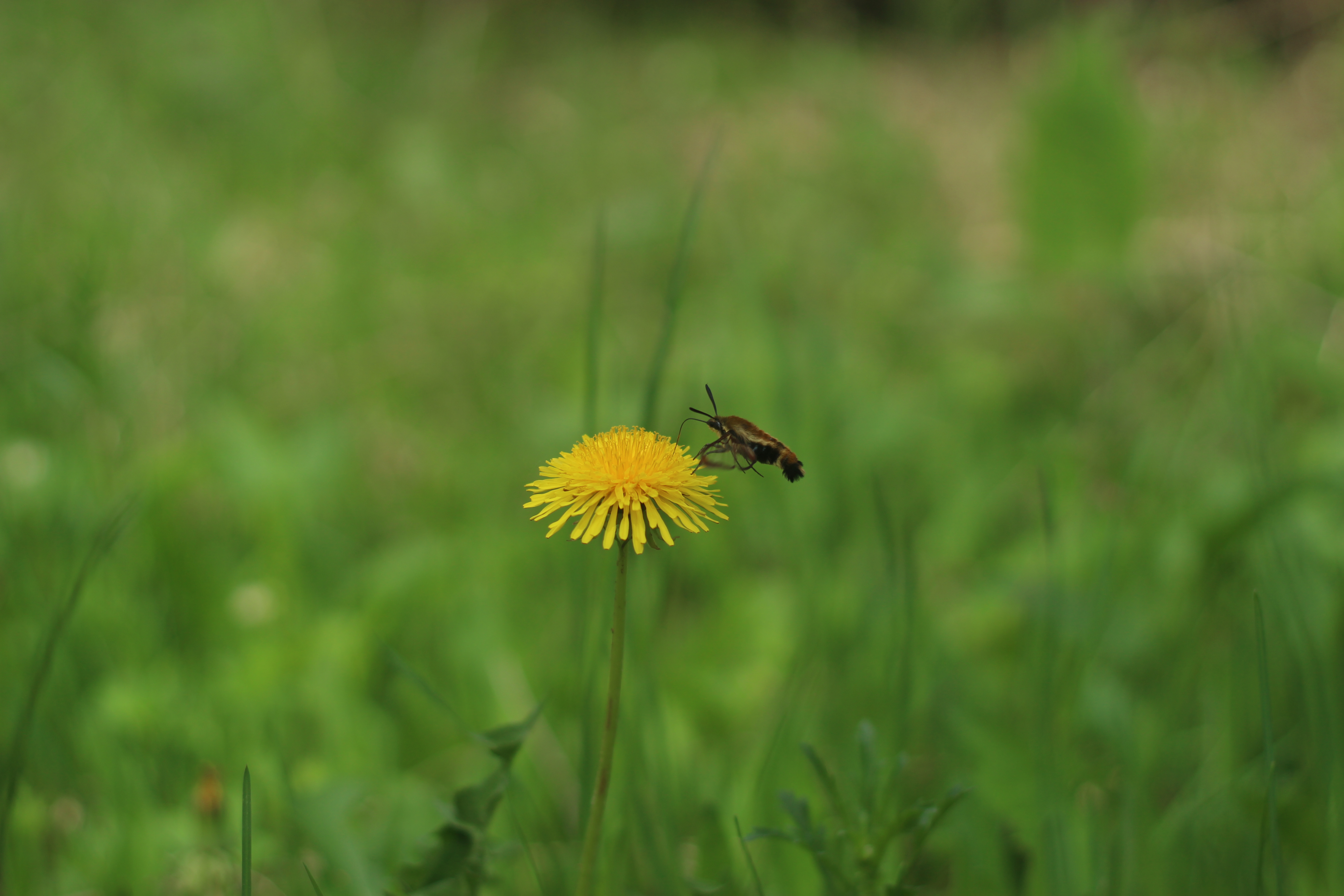 A Hummingbird Moth visiting the dandelions along the path to our tent.