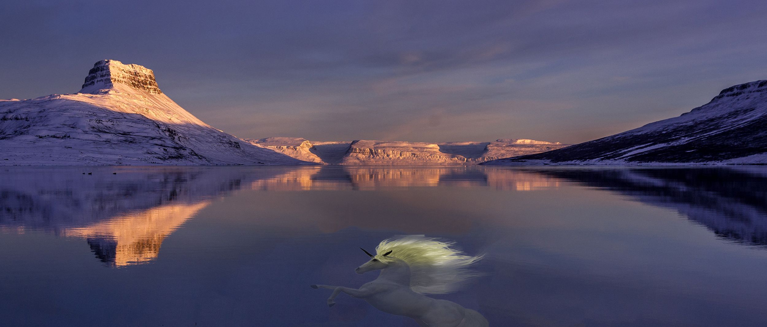 A good, sensible, unicorn standing on the hill, reflected in the water. Very nice!