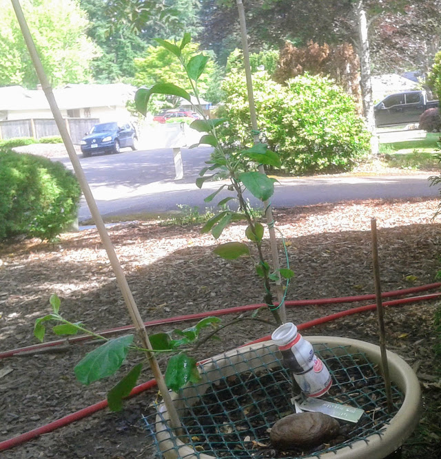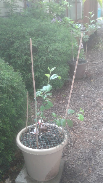 A couple of my dwarf apple trees are looking super healthy this year and putting on more growth than ever before. I grow these in pots in the front of the house where they get lots of sun, and some cool shade from a sumac tree above.
