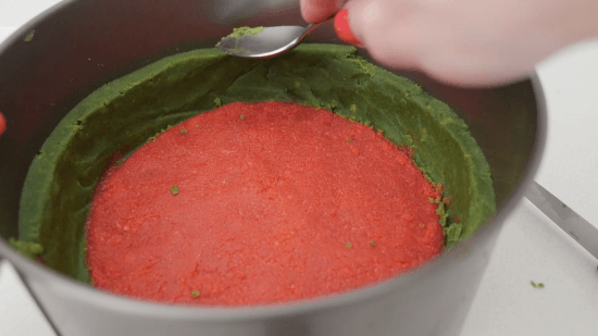 Pour the red crumbs into a loose based cake tin, mine is 21cm (8.27 inches) in diameter and use the back of a spoon to squash it flats. Make a space around the edge for the green.