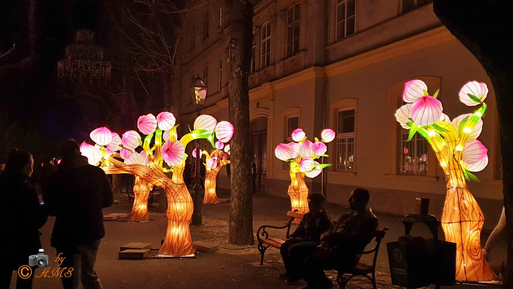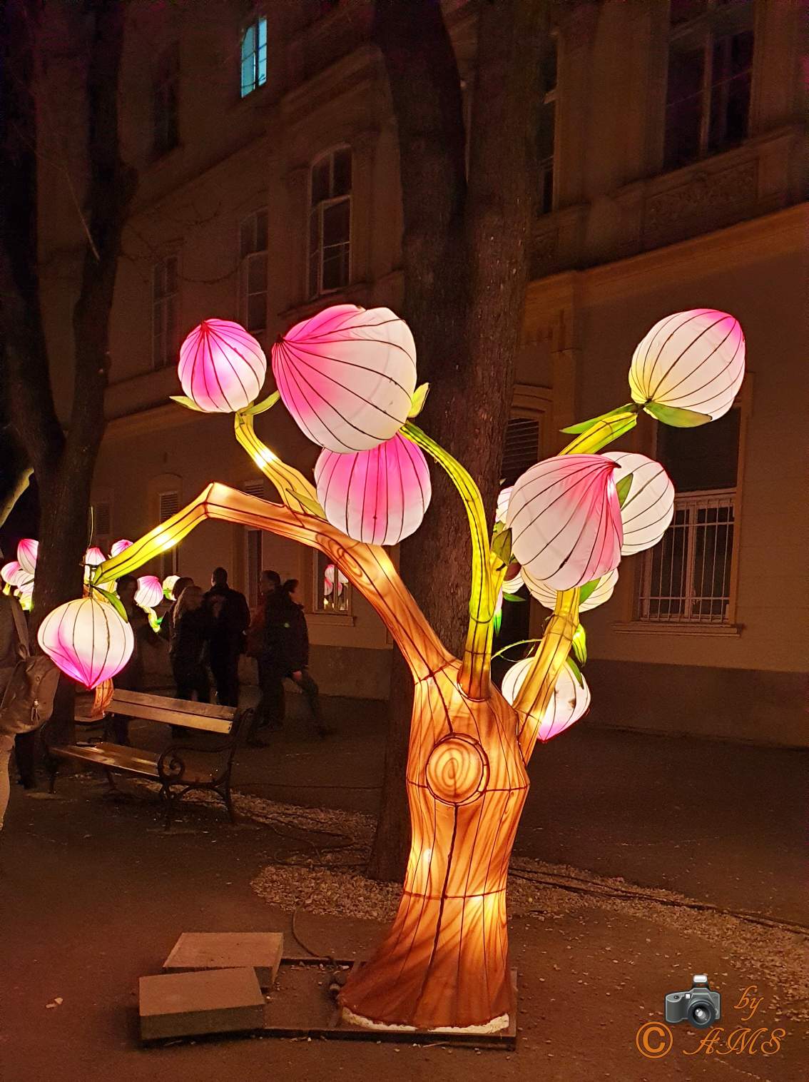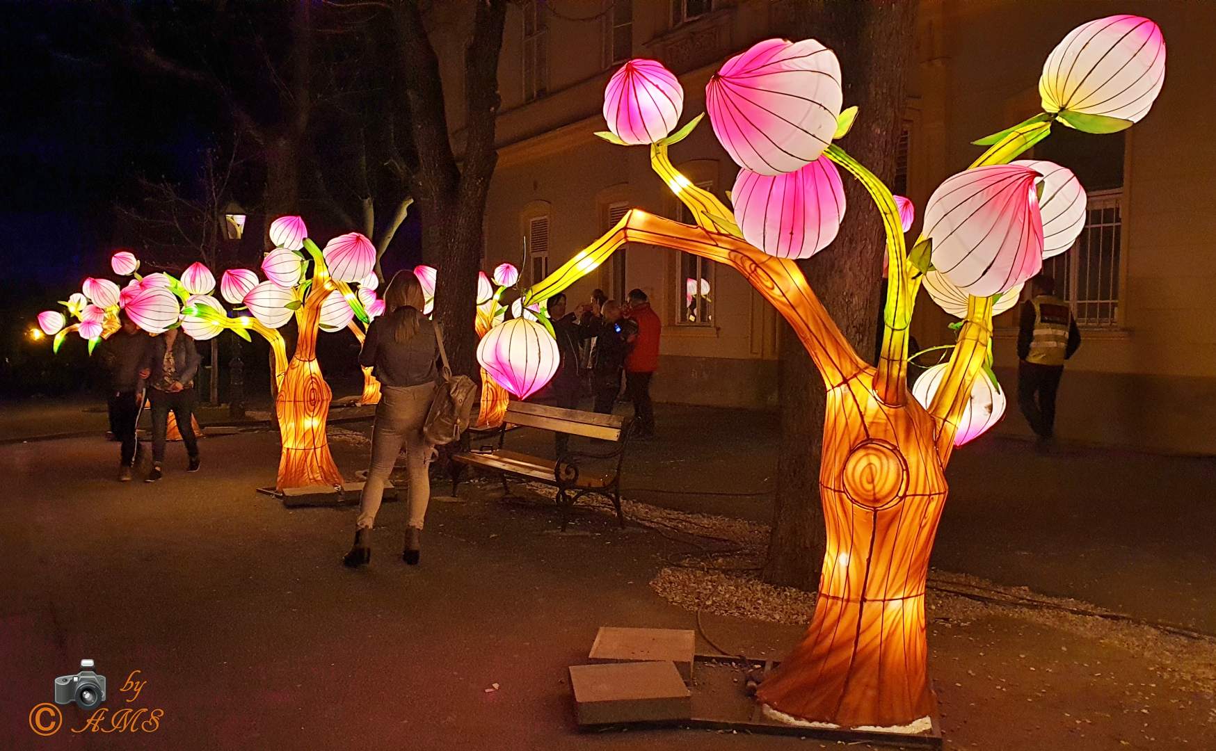 Peach blossom lanterns illuminated the western part of Strossmayer Promenade in the center of Zagreb (Croatia) during the Festival of Lights 2019 held in March.