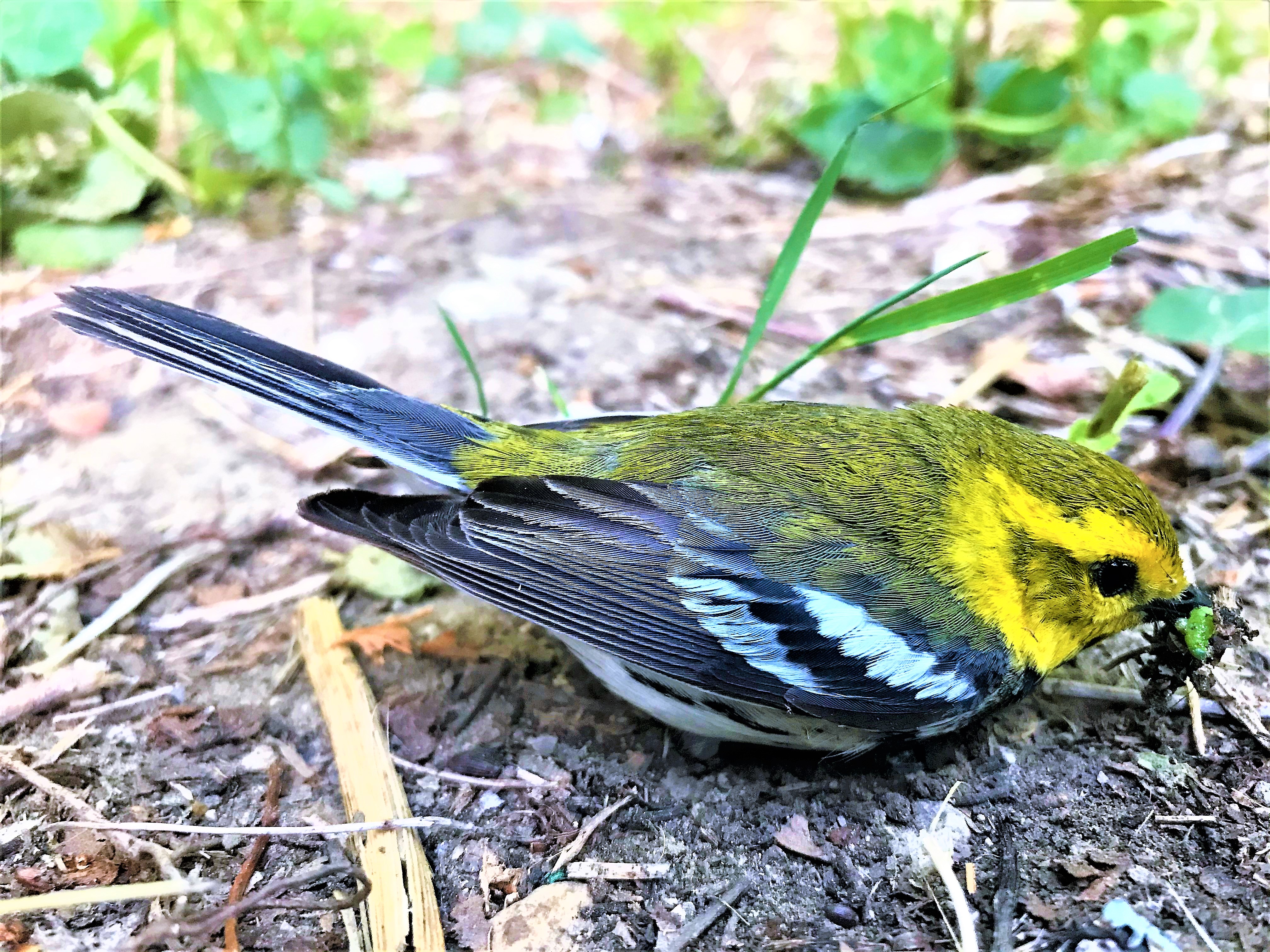 En me baladant derrière chez moi, j'ai aperçu par terre cette mignonne petite Paruline, brindille au bec.
