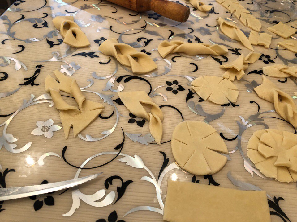 Knead the steep dough from all the ingredients listed. Roll out a thin layer, and then cut and make the figures that you like best.