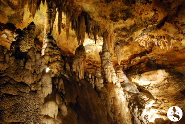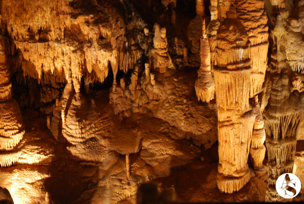This room has several formations over a gradual slope which gives it a look of an amphitheater seating.