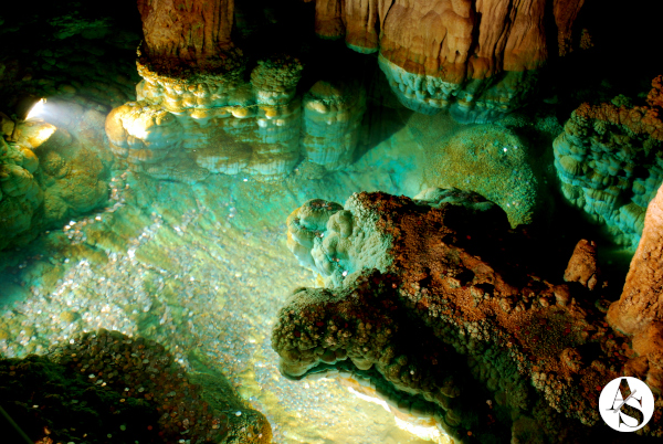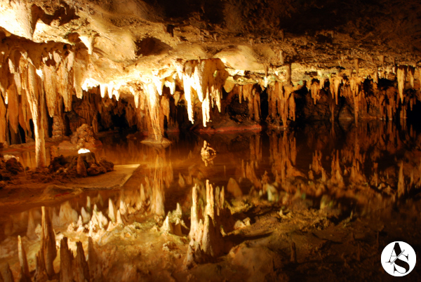 There is a spring of water in the caverns which accumulates into a small pond. The water is so still that it gives it a mirror-like appearance and the reflection of stalactites can be clearly seen.