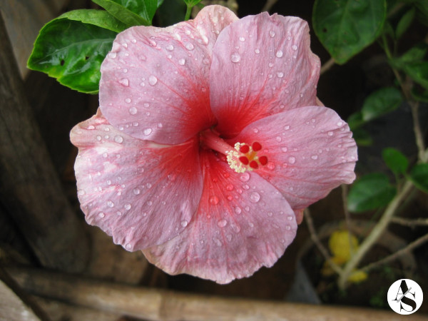 A nice hibiscus flower fresh after rain. You can actually see the rain droplets that have formed on the flower petals. The pink colored petals and complementing red center gives these flowers their lovely beauty.