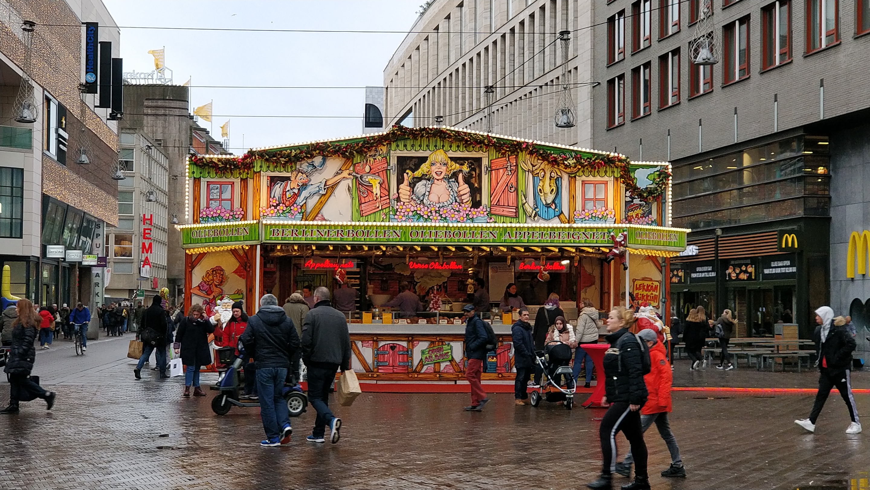 I had the idea that I would take a picture of this Oliebollenkraam on the Spui and the main shopping street that is in Den Haag (The Hague) in Netherlands. It turned out to be a pretty nice contrast between the very colourful Oliebollenkraam and the bleak weather and the gray shopping mall buildings. A little splash of colour in the commercial grayness of Christmas!