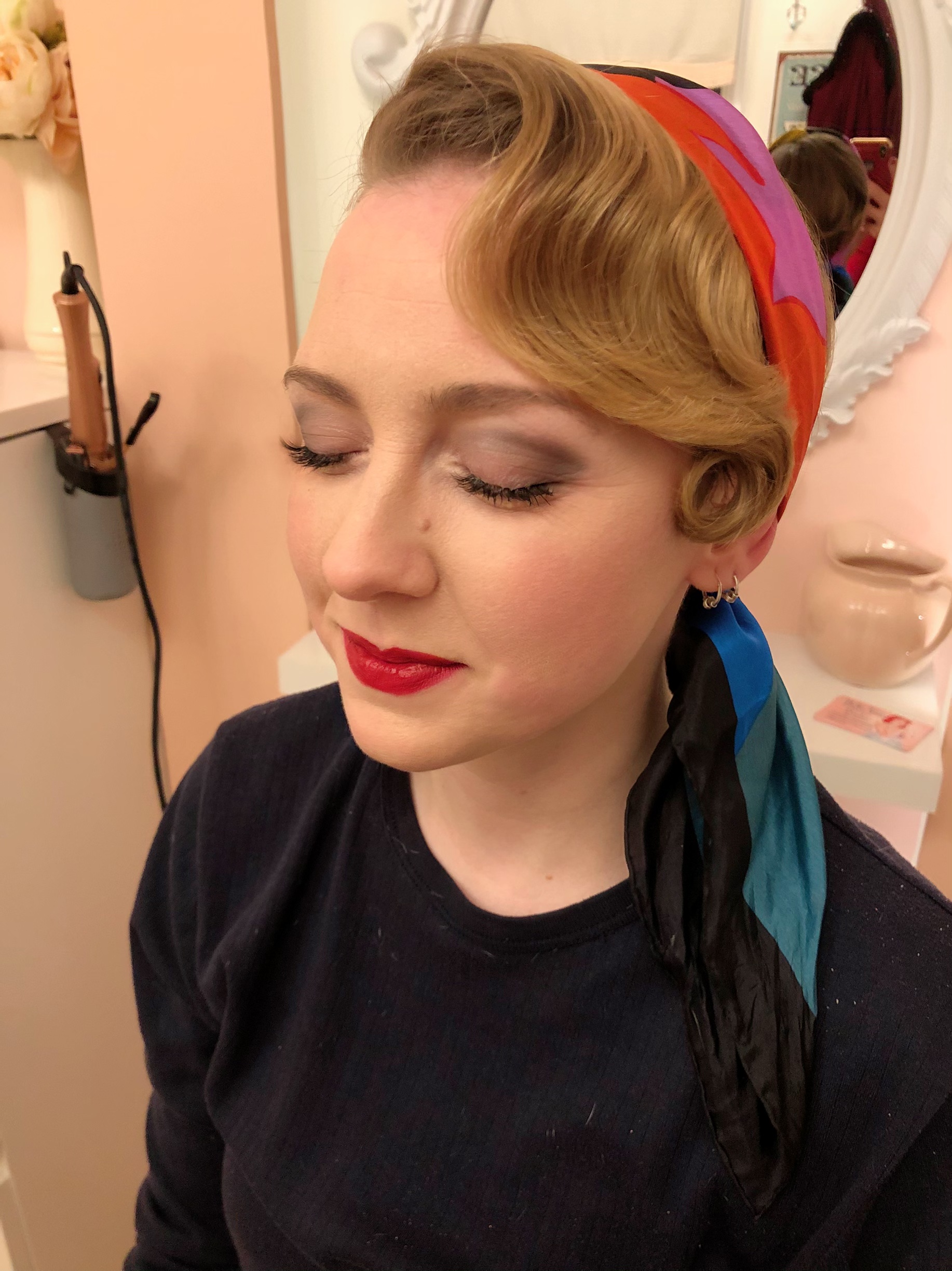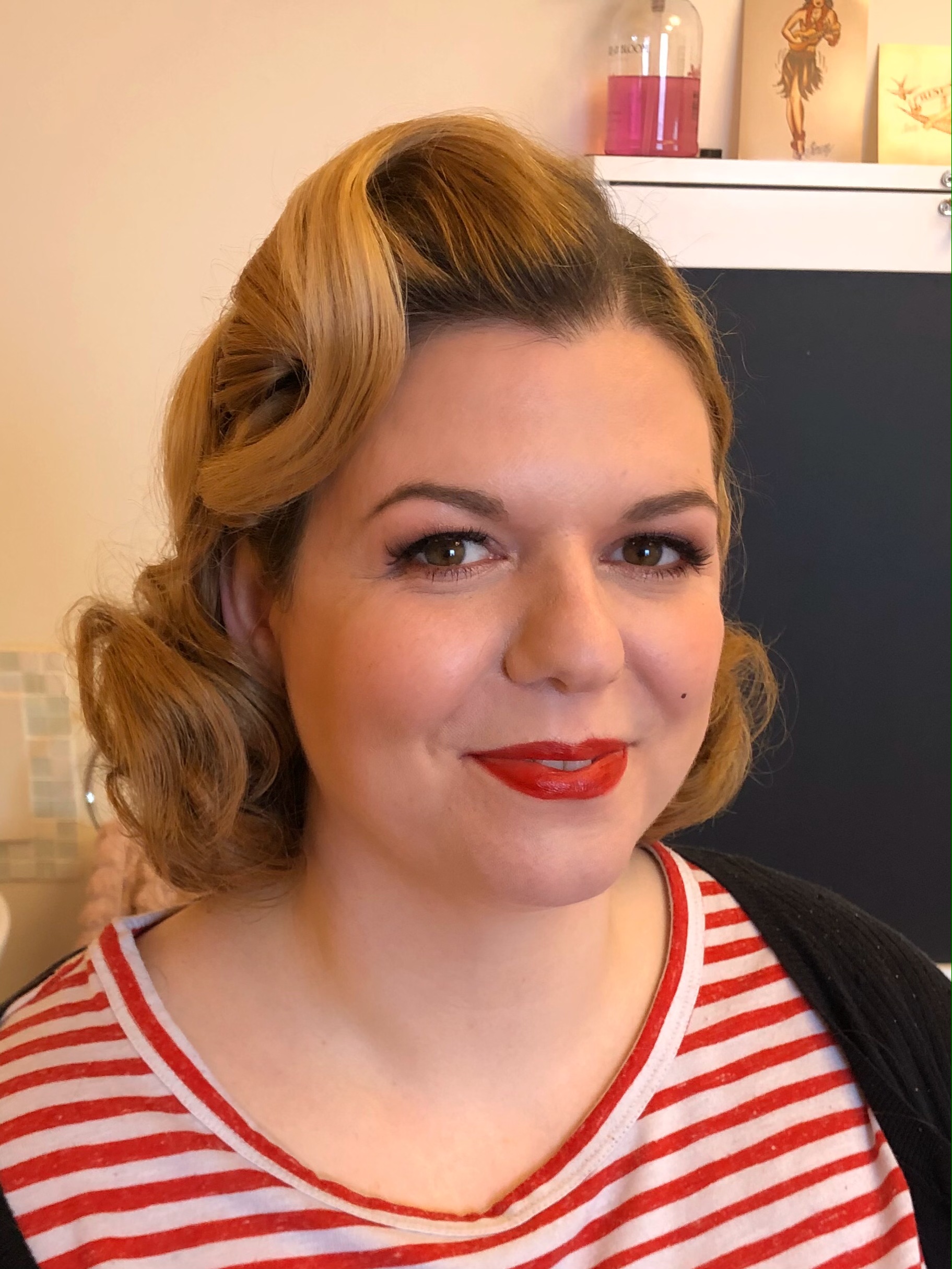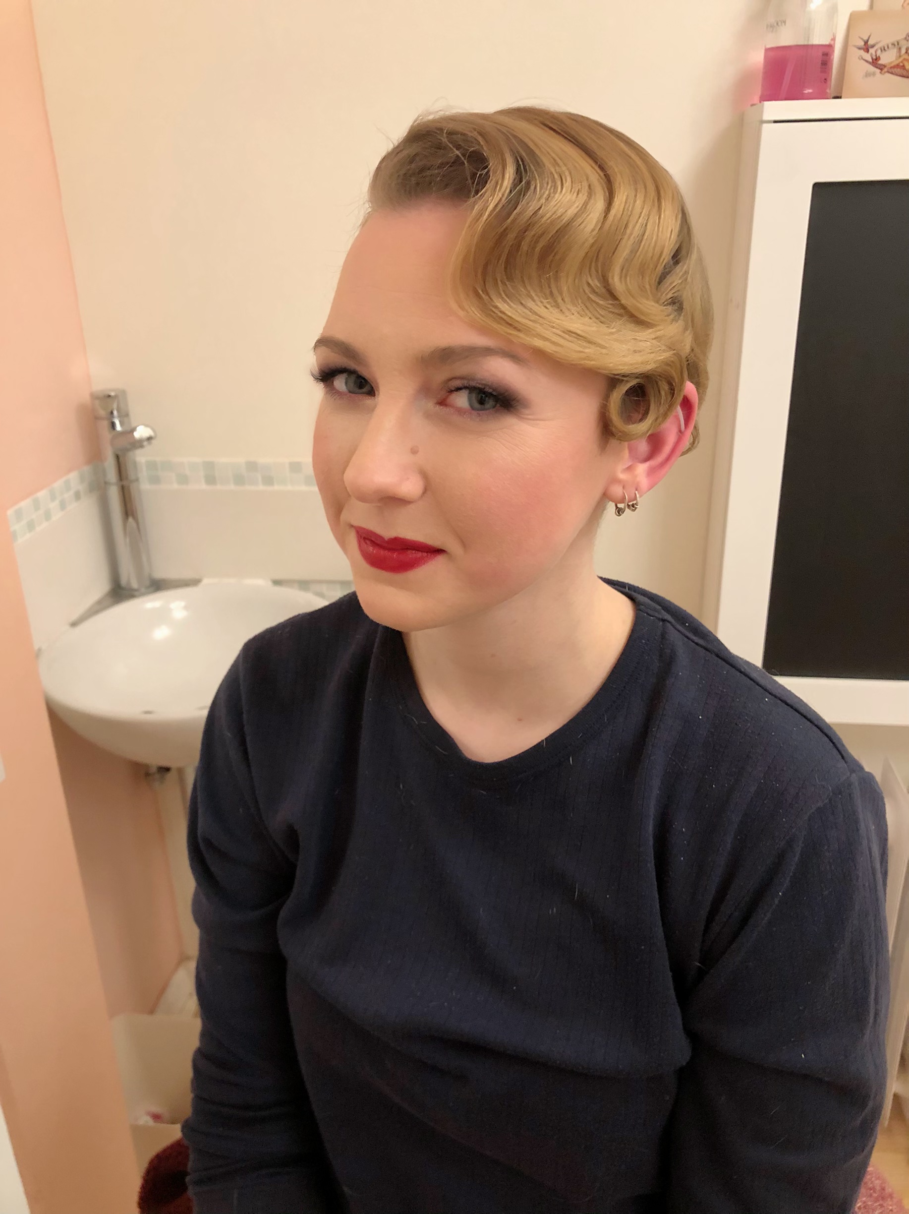 My first client of the day was Sarah. Sarah was heading off to compete at a burlesque competition. Her act that she was performing was based around Marilyn Monroe, so she wanted a classic 50s look. I went for a classic pincurl set. Curling 1 inch sections downwards, and pinning in place to cool, whilst I did the makeup. Again a classic pinup look, with the cat eyes and red lips. Forever a firm favourite of mine. Once the makeup was done I was able to remove the pin clips and brush out those curls. The look of horror on some ladies faces when they see me take a brush to the curls! But this is the vintage way and it's how we create those uniform curls.