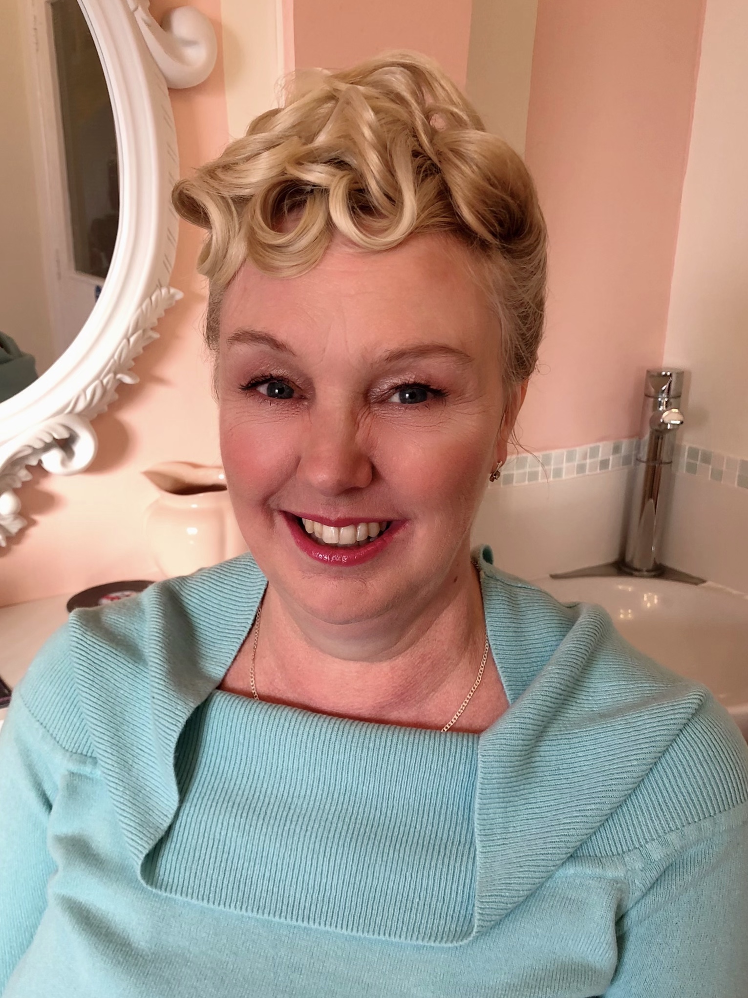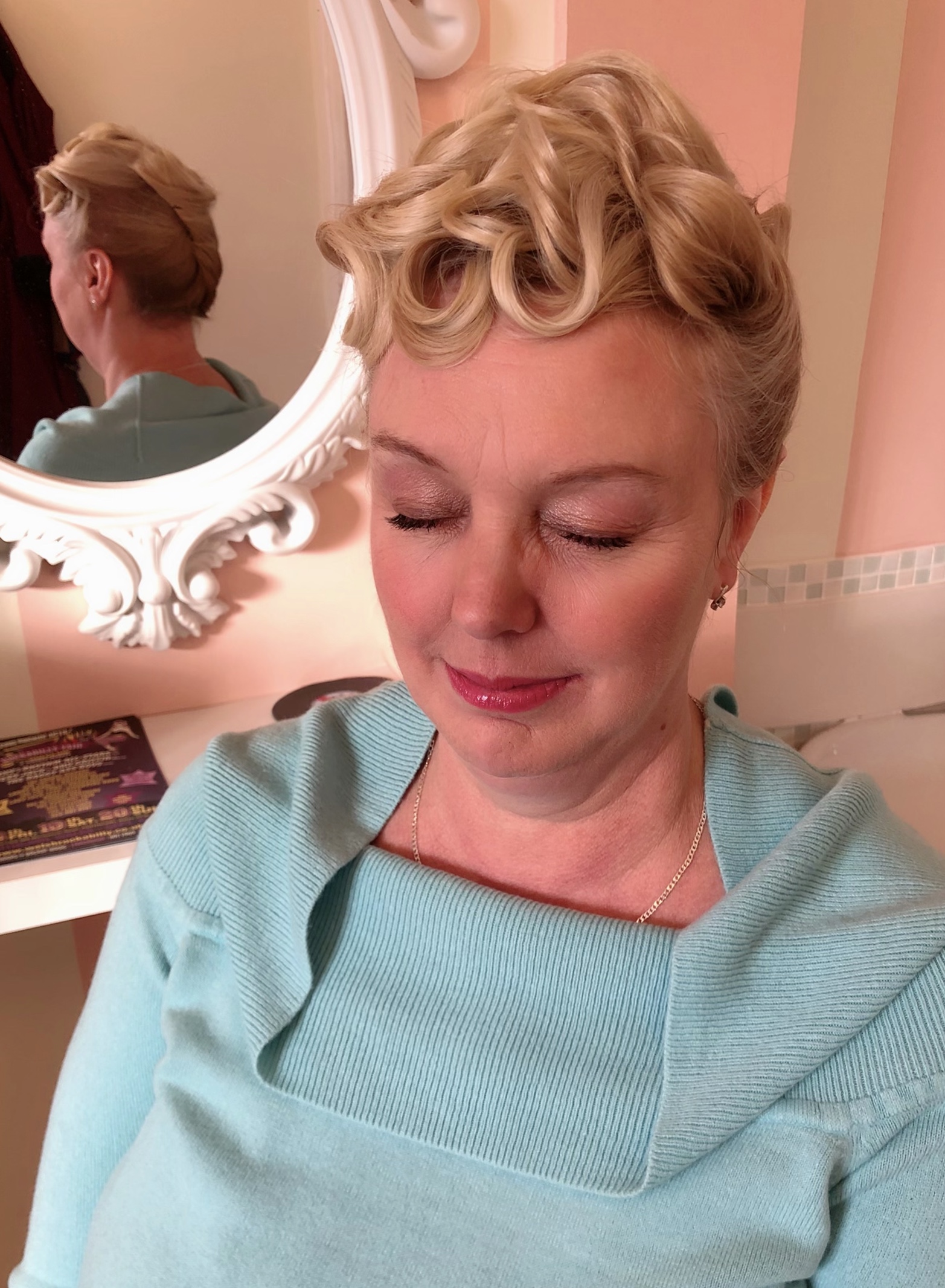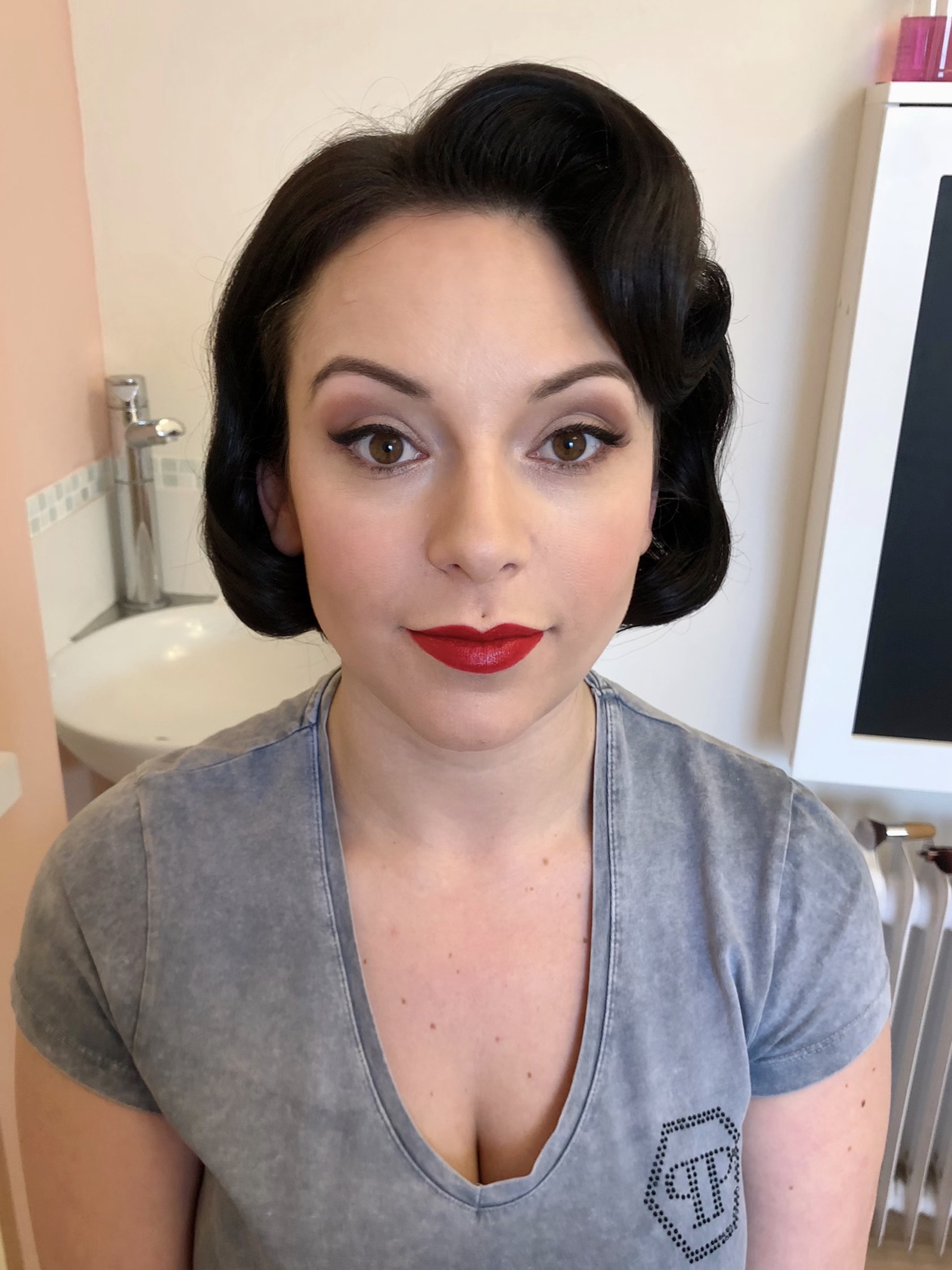 My first client of the day was Sarah. Sarah was heading off to compete at a burlesque competition. Her act that she was performing was based around Marilyn Monroe, so she wanted a classic 50s look. I went for a classic pincurl set. Curling 1 inch sections downwards, and pinning in place to cool, whilst I did the makeup. Again a classic pinup look, with the cat eyes and red lips. Forever a firm favourite of mine. Once the makeup was done I was able to remove the pin clips and brush out those curls. The look of horror on some ladies faces when they see me take a brush to the curls! But this is the vintage way and it's how we create those uniform curls.