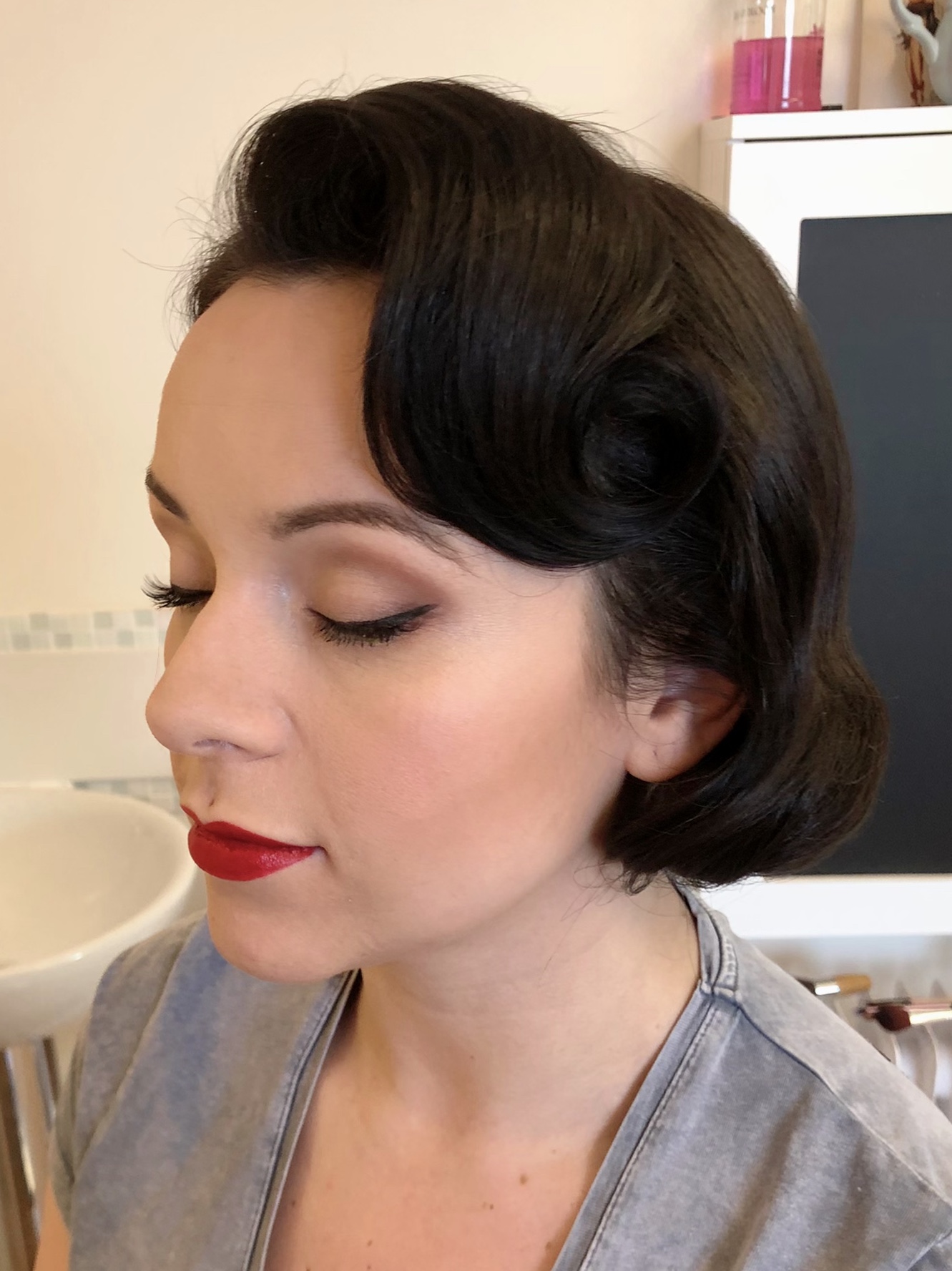 Client number two was the beautiful Terri. Terri has never tried a vintage look before, so it's always a little nerve wracking showing the client the finished look! Will she like? Won't she? Luckily she absolutely loved the look, and I think she wears it so well. Her skin and features were an absolute dream to work with. The makeup seemed to glide on effortlessly, and she just has the most beautiful eye shape, emphasised by the classic black eyeliner.