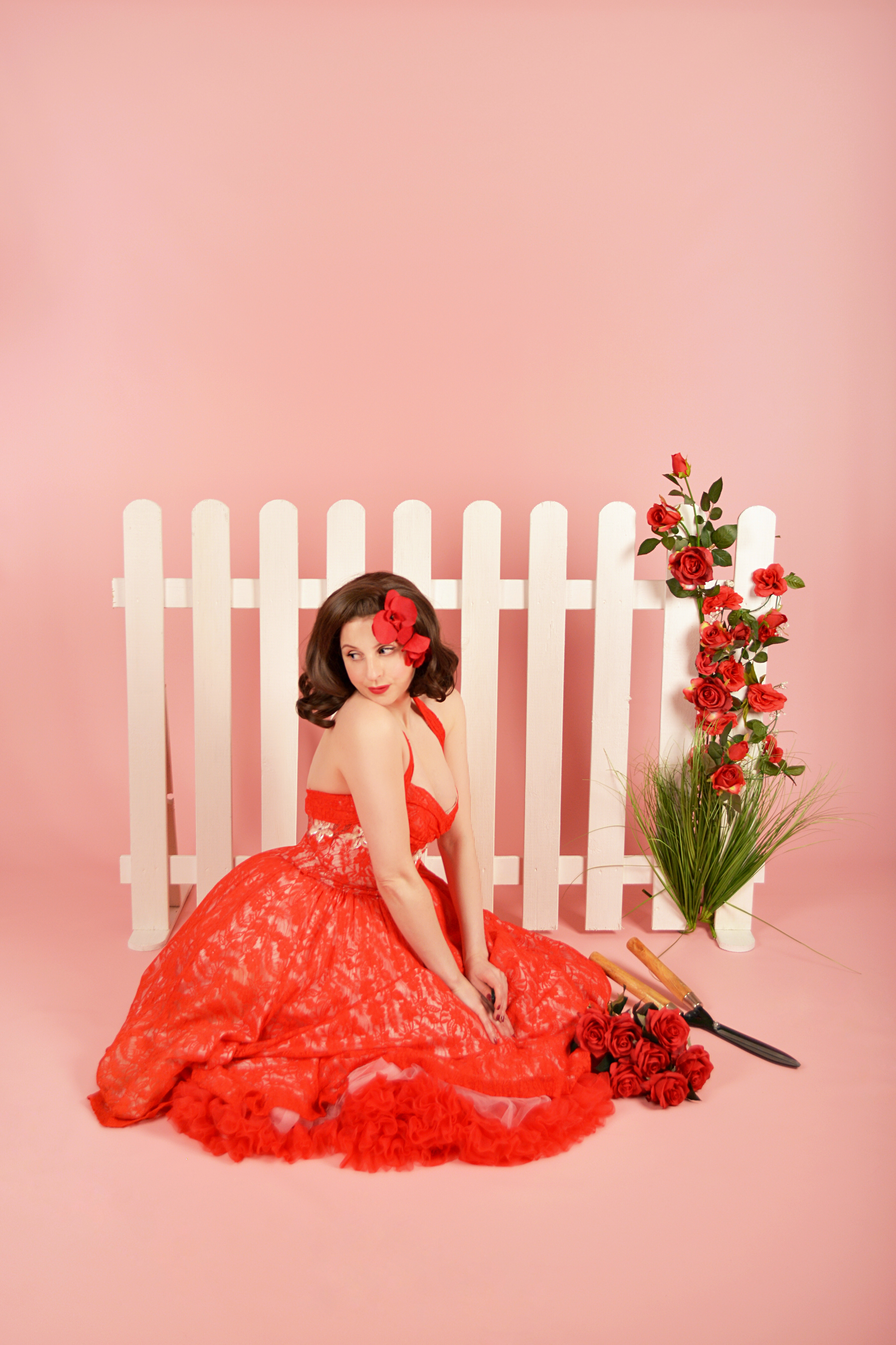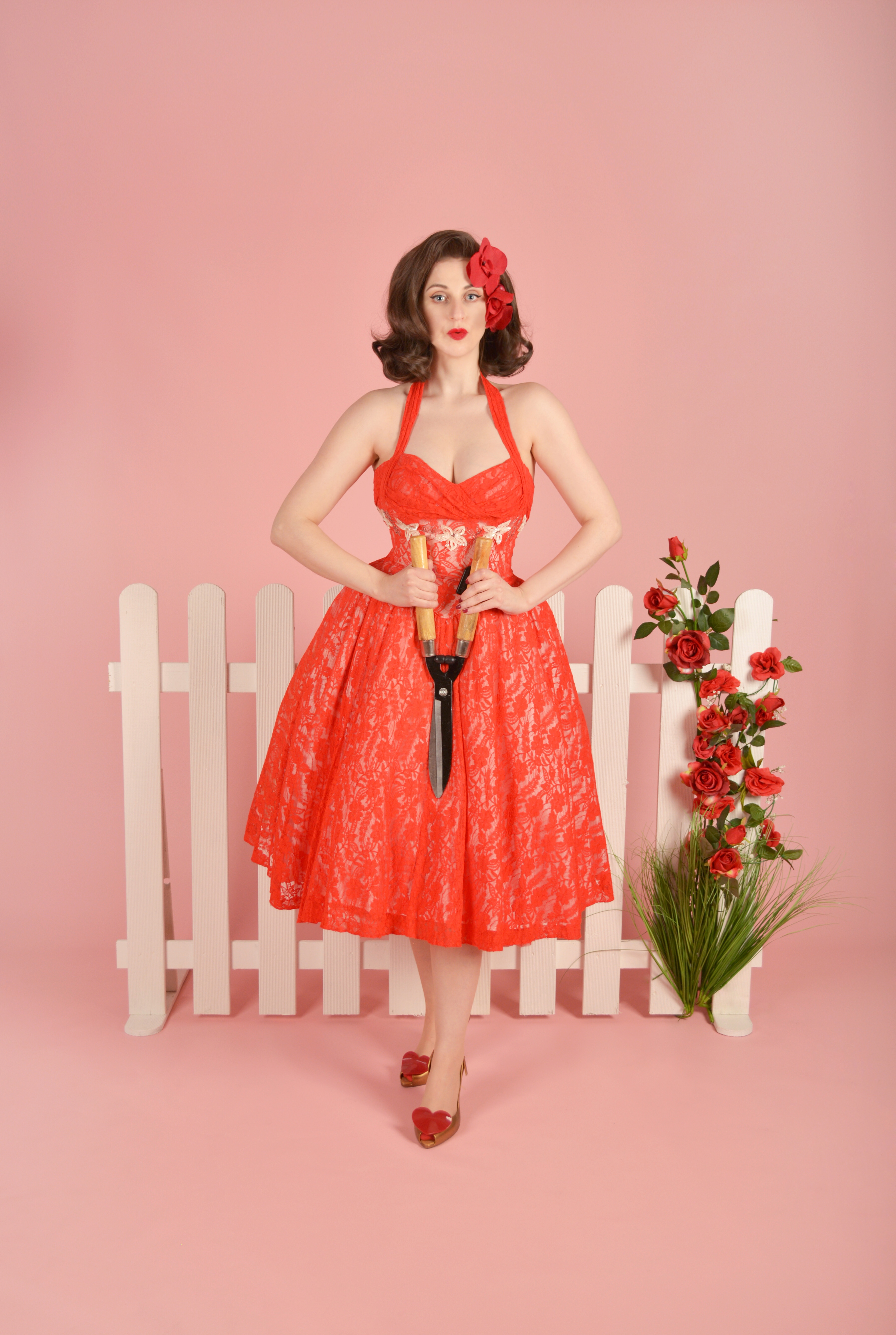 When pulling together set I had this image in my head of a 50s housewife feel with a little edge, by way of the addition of some gardening shears. A little touch of horror B-movie 😂