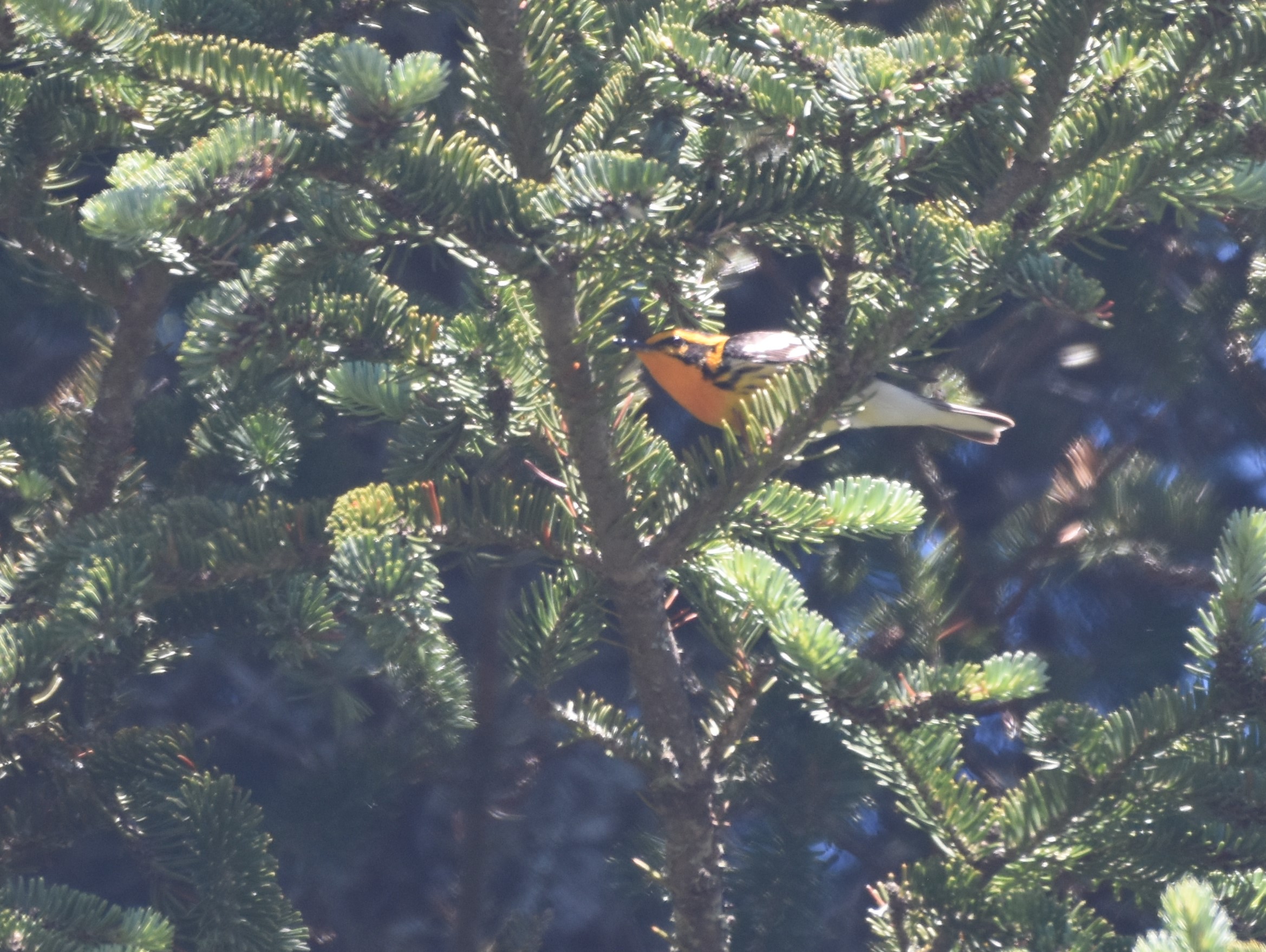Blackburnian Warbler Setophaga fusca is one of the more special of the wood warblers, with it's orange breast and head stripes. Don found this guy high in a fir tree.