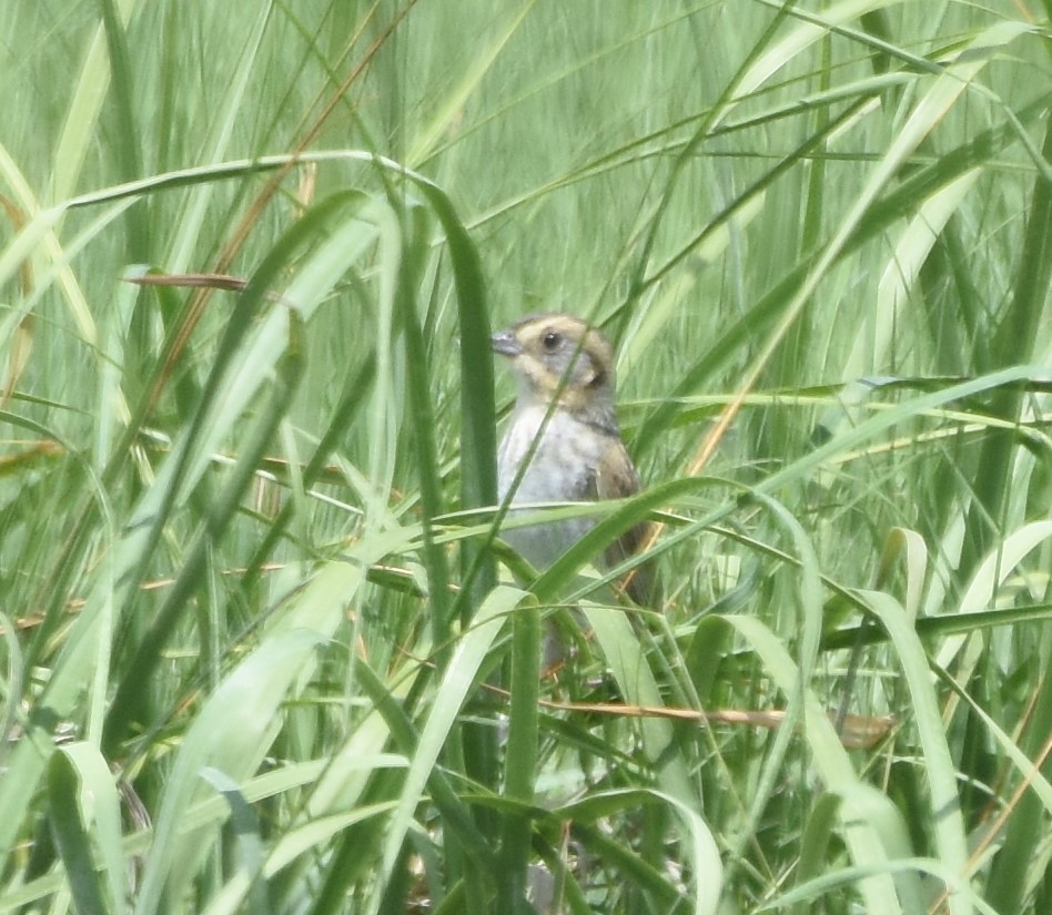 I believe that this is a hybrid between Nelson's Sparrow and Saltmarsh Sparrow. Locals use the old name for the two species before they were split into two species for these birds, "Sharp-tailed Sparrow." Note the whitish breast typical of Saltmarsh Sparrow but the indistinct blurred flank and belly streaks more typical of Nelson's Sparrow.