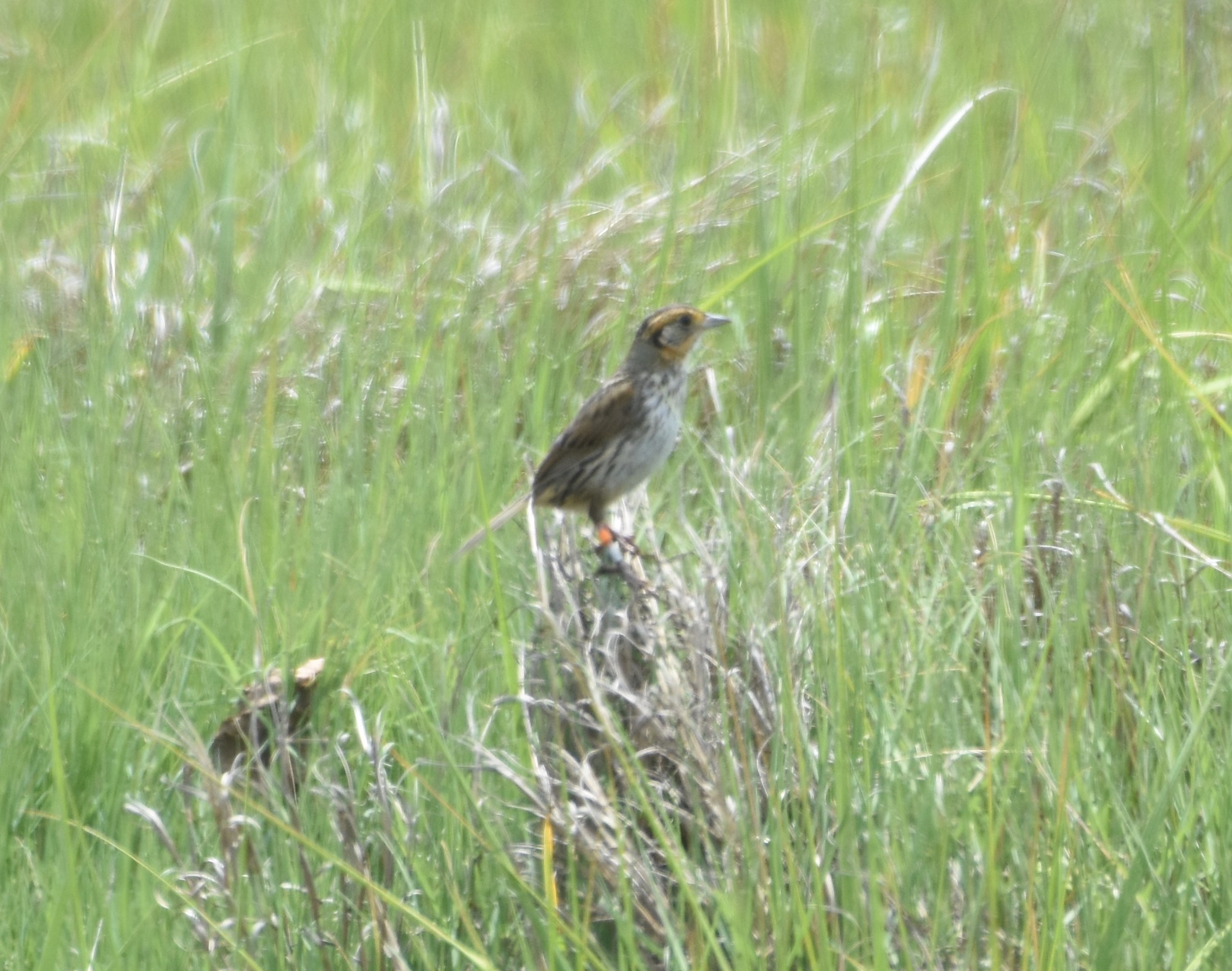 On this Saltmarsh Sparrow note the whitish breast and belly lacking the orangish wash expected on a Nelson's Sparrow and the crisp dark streaking on the flanks. Also check out the leg bands.