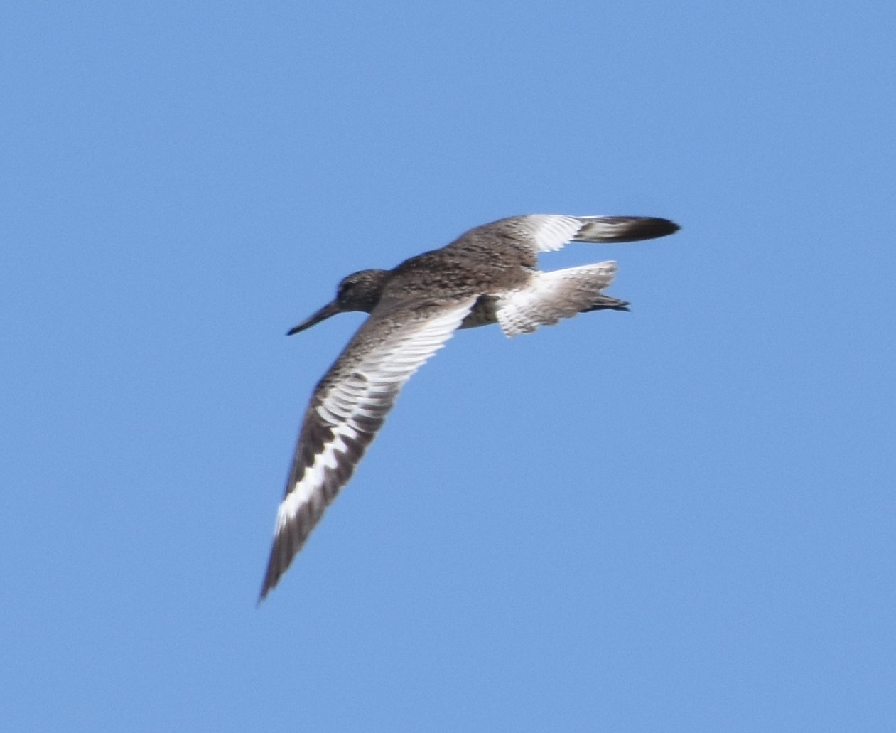 A WIllet in flight. Note the very wide white wing stripe, so this is the Eastern subspecies of Willet.