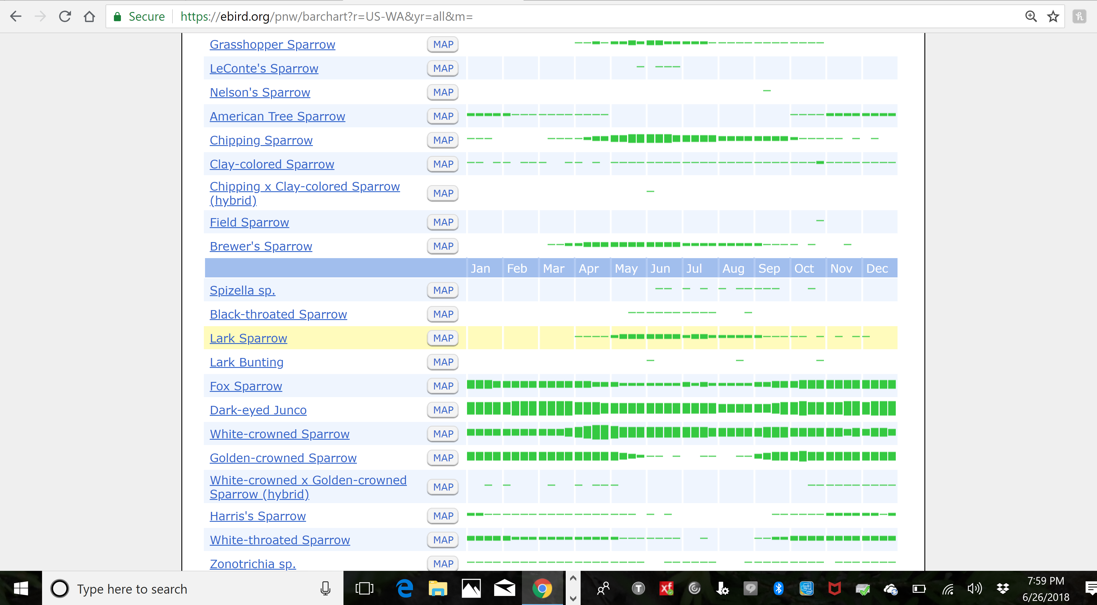 Lots of sparrows here. This is a screenshot of just one page of the sparrows in Washington State alone from eBird.