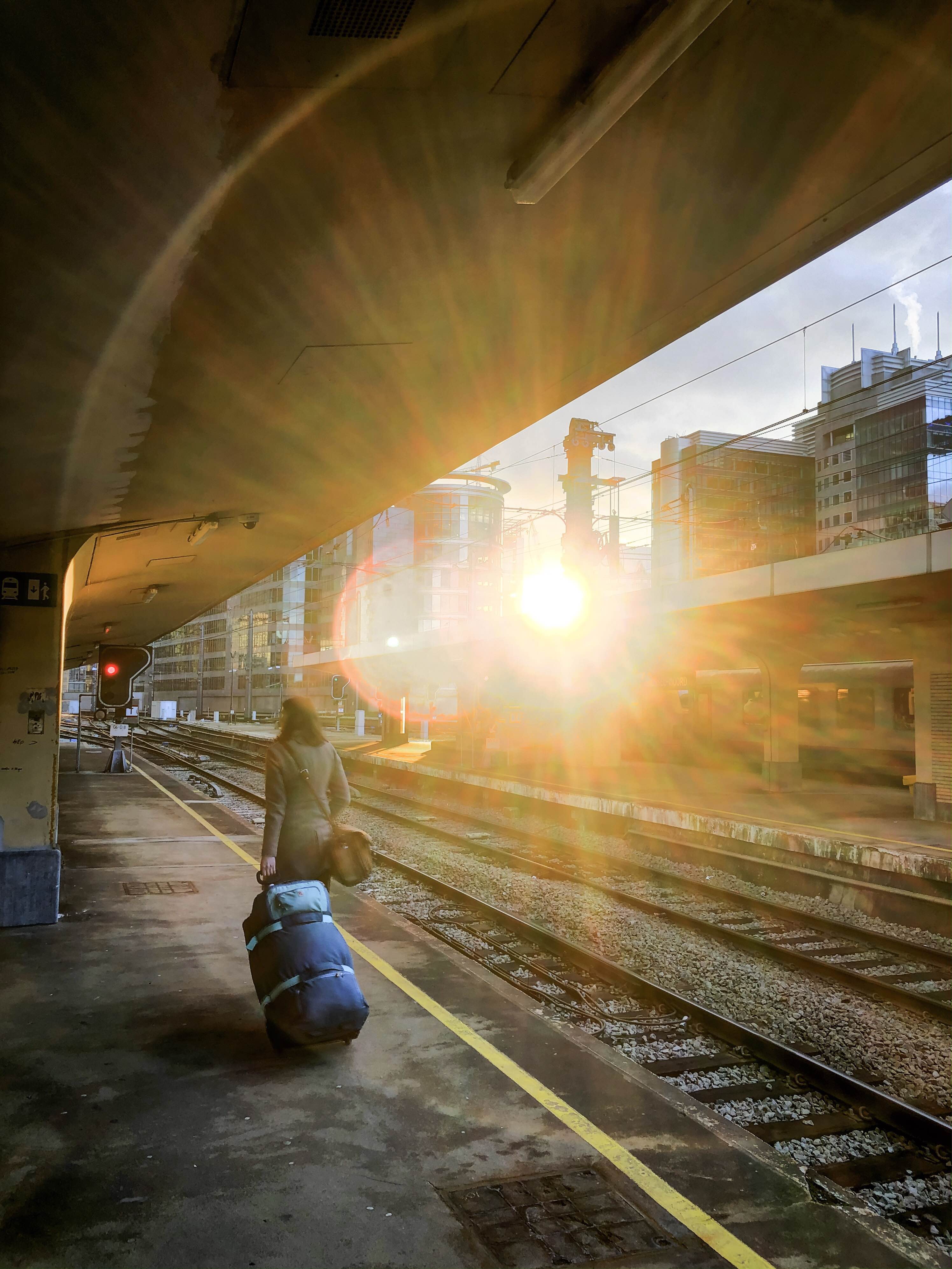 An unrecognizable young woman carrying her luggage over the platform of a railway station covered in an bright and colorful halo of light from the setting sun.