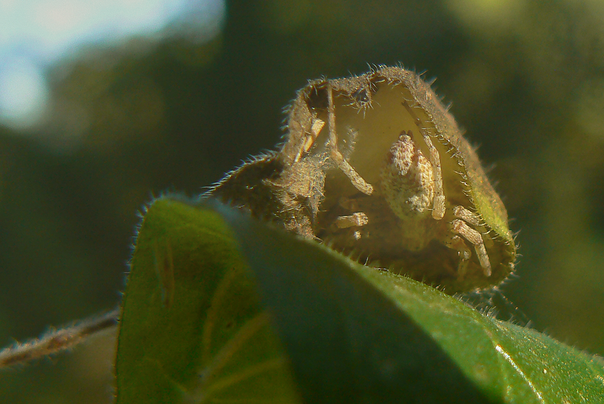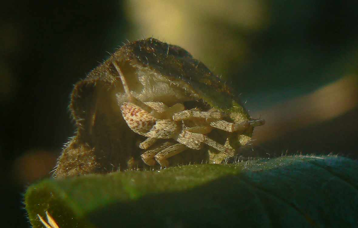 ... if you take a better look, you'll see that the dried out leaf isn't just any fallen leaf, but this leaf is a home ... some sort of tent ... carefully shaped ...
